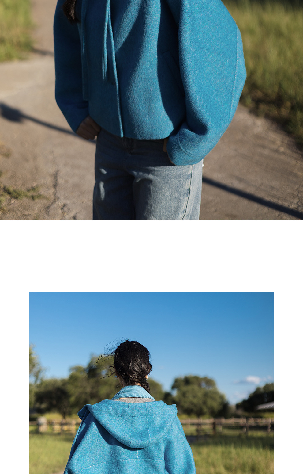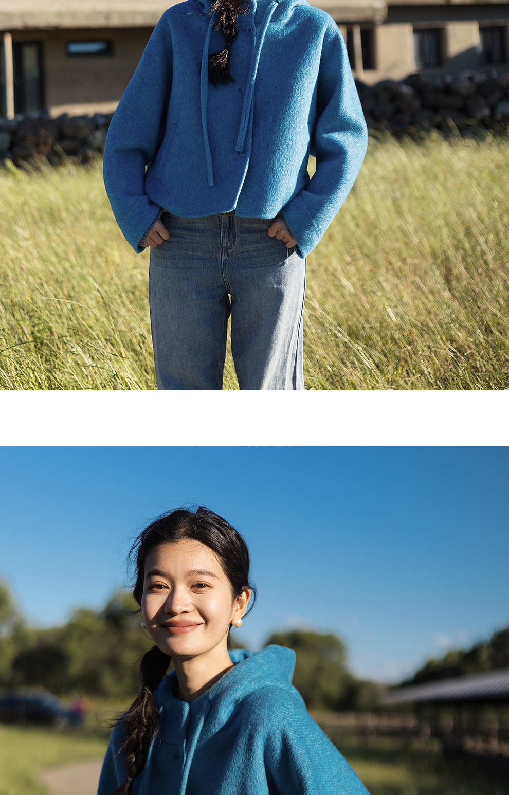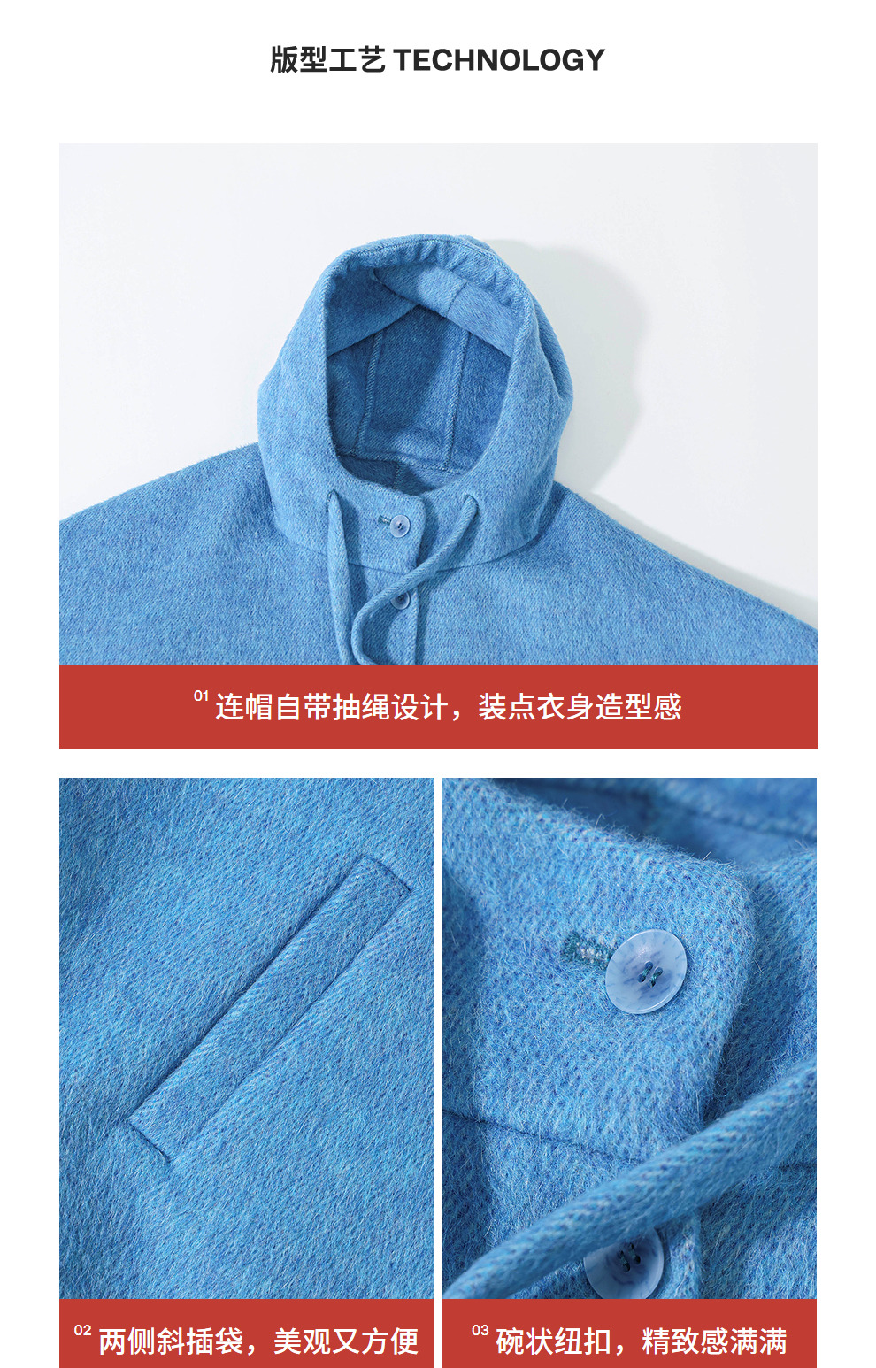 绽放646朵/绵羊毛设计感连身袖带帽短款毛呢外套新款呢大衣女秋冬
