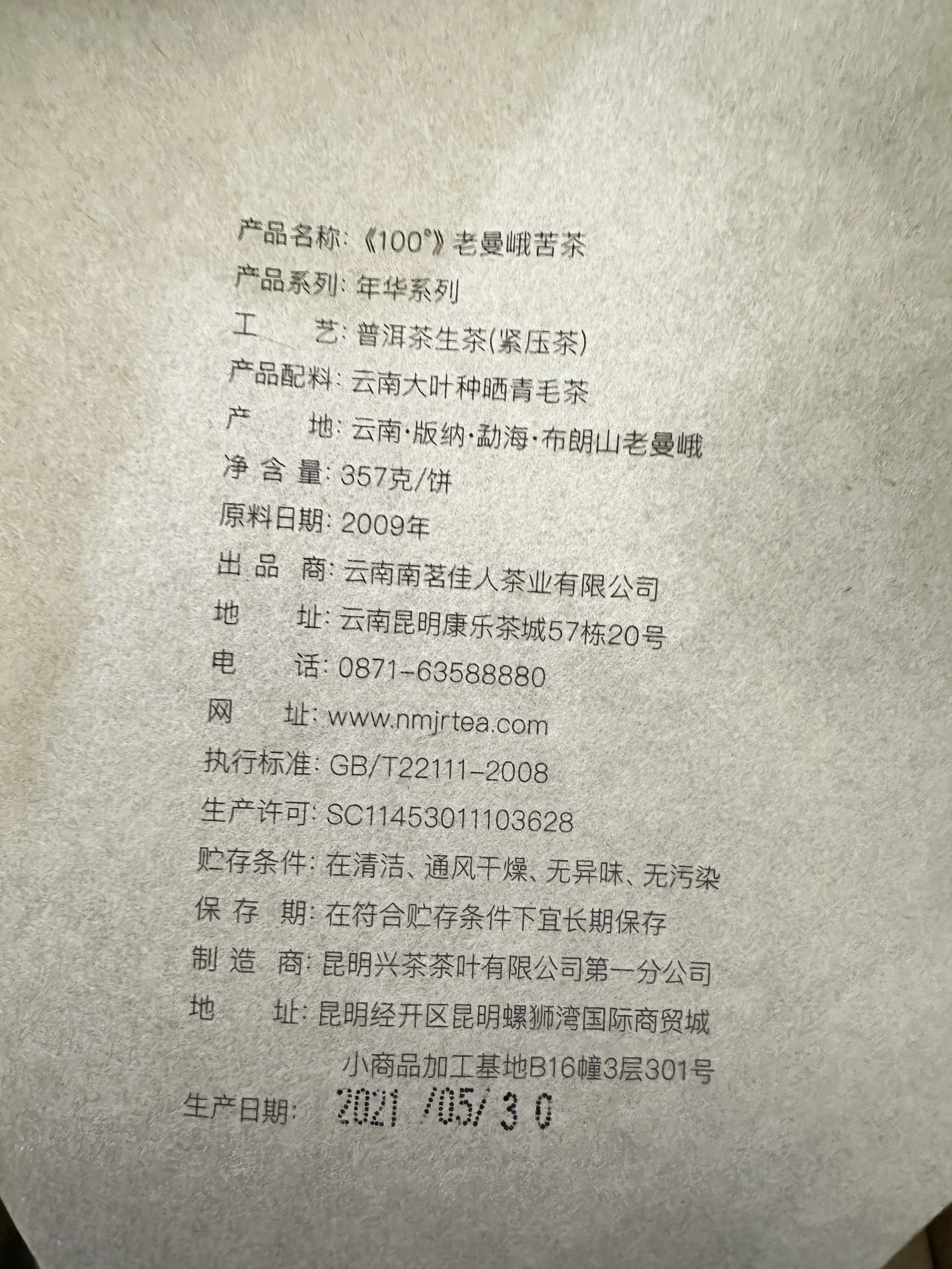 【秒杀】2009年《100度》老曼峨纯苦茶 357克*1饼 生茶