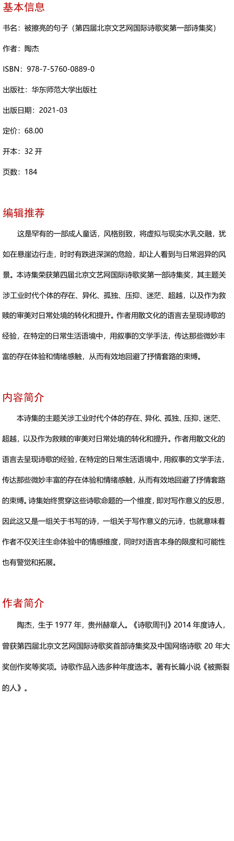 被擦亮的句子 第四届北京文艺网国际诗歌奖第一部诗集奖 陶杰诗集 中国现当代诗歌