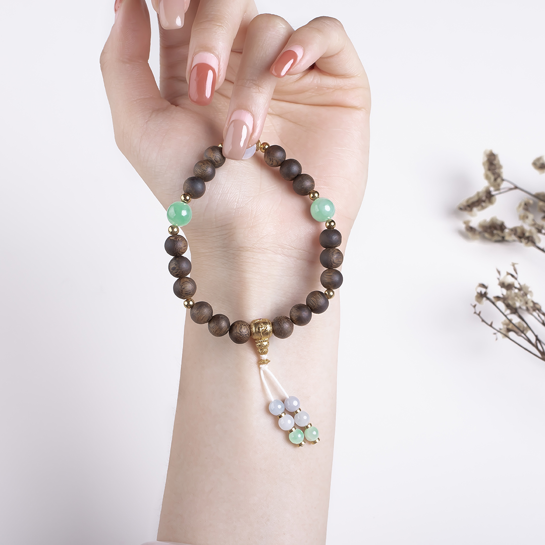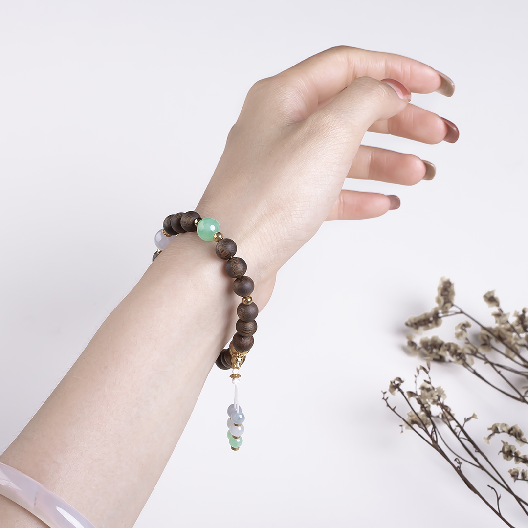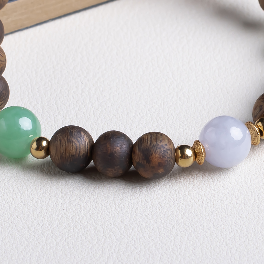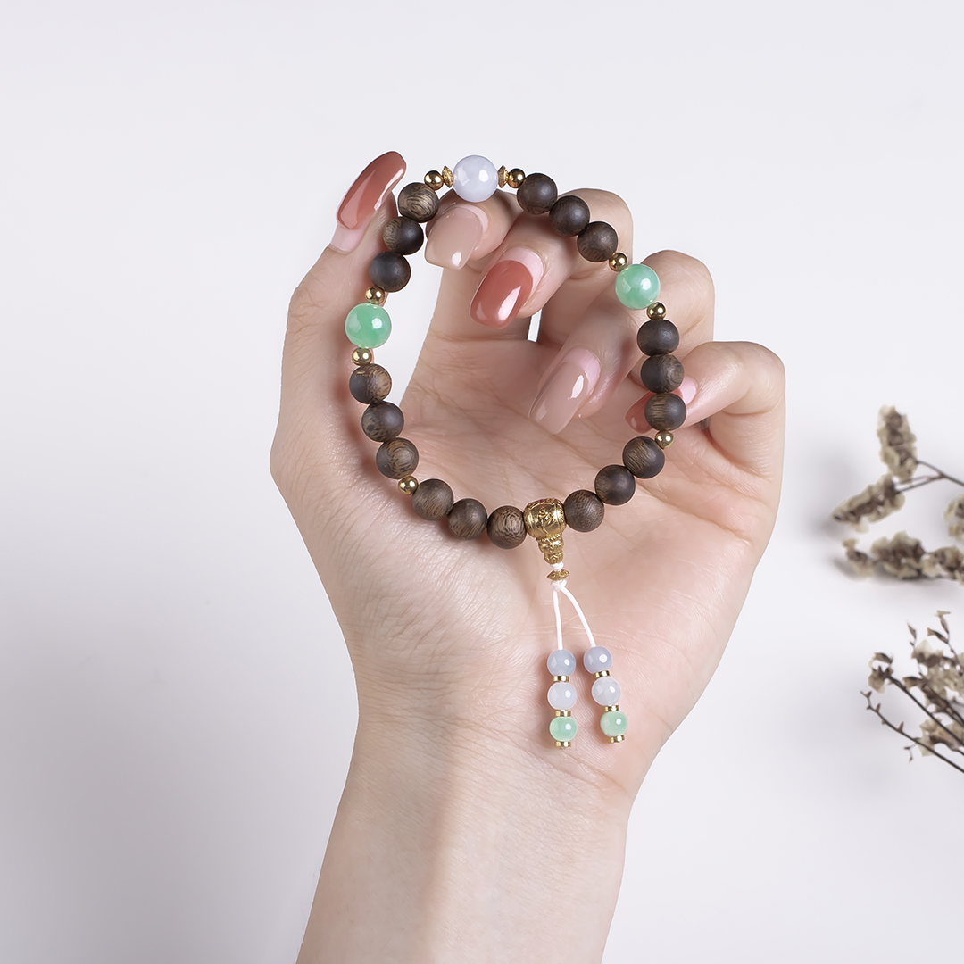 xy0428沉香+翡翠手串.银,天然沉香7.3mm,原色原味,香味自然清甜,国风穿搭,香玉结合,清香安神,玉润养身。