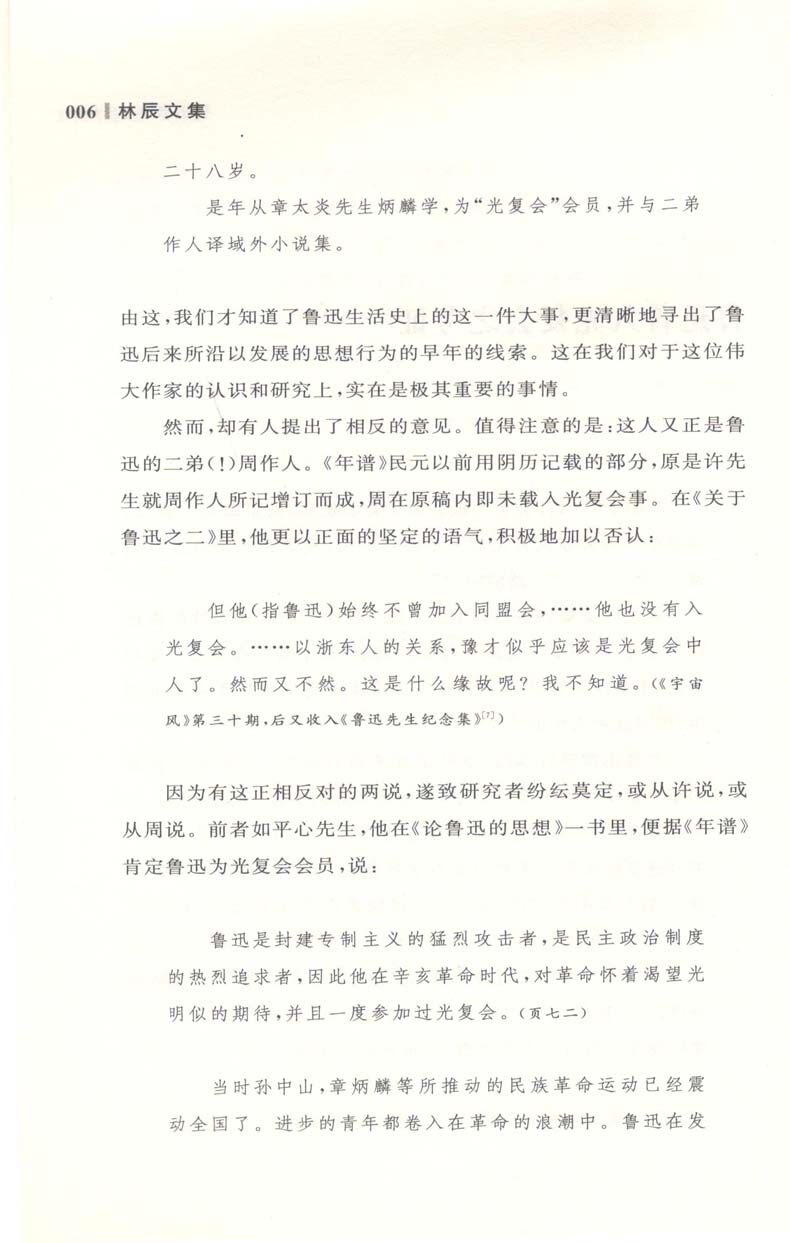 《林辰文集》共四辑。本辑收录《鲁迅事迹考》与《鲁迅传》。《鲁迅事迹考》:书中各篇作于一九四二年至一九四五年之间。《鲁迅传》:四十年代初,作者在撰写《鲁迅事迹考》的同时,即开笔写作筹划已久的《鲁迅传》,至五十年代初,已写出八章。其中前二章及第三章上半部分曾连载于一九四九年由林如稷在成都编辑的《民讯》月刊第四、五、六期上,后几章因刊物停办而未能续载。后因工作调动,作者将主要精力投入到《鲁迅全集》的编辑与注释中,不得已中止了《鲁迅传》的写作。已完成的前八章手稿一直藏于箧中(其中第六章手稿佚),未能结集公开出版。作者去世后的二○○四年五月,由编者据手稿整理校订后交由福建人民出版社印行第一版。