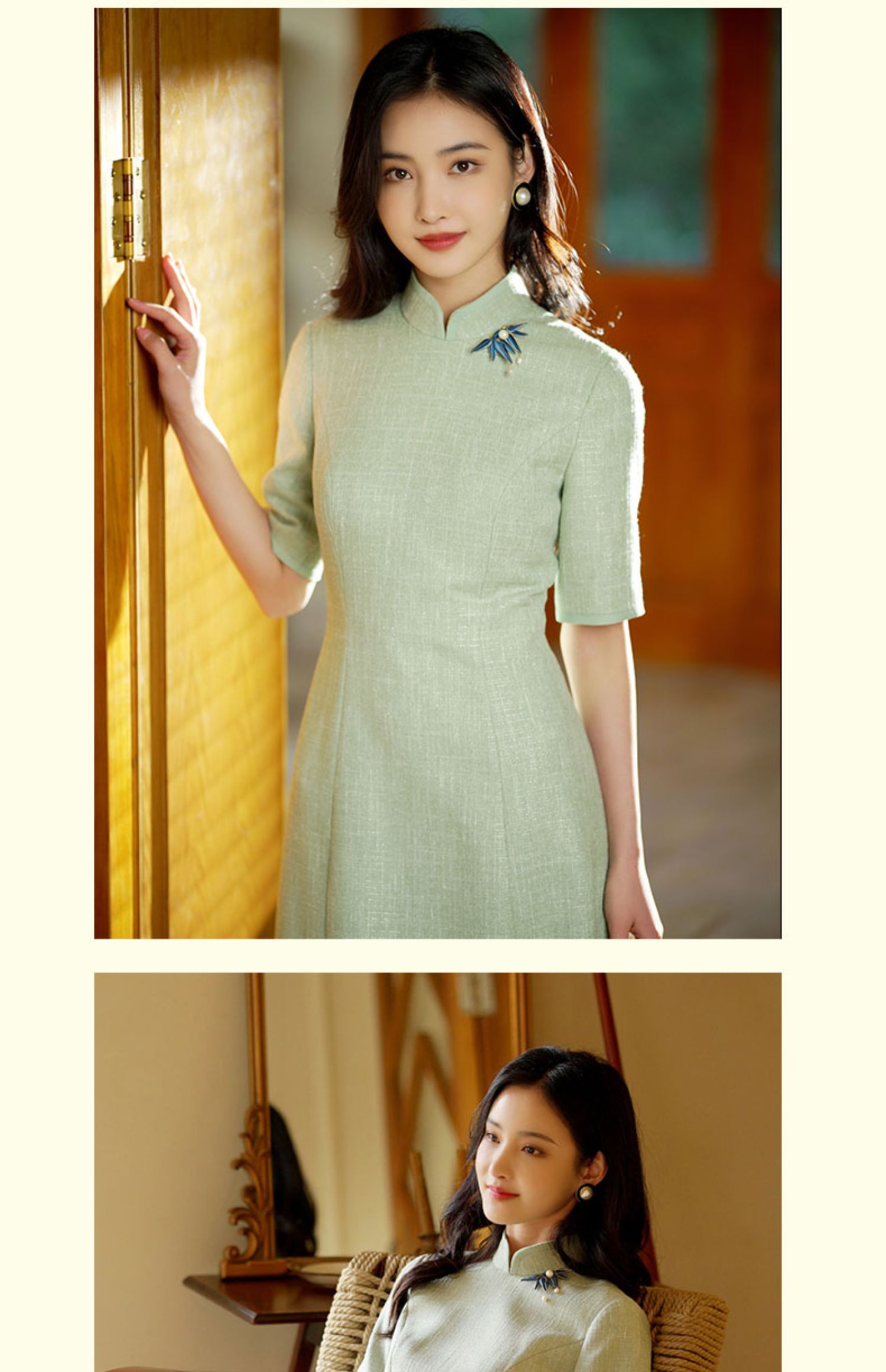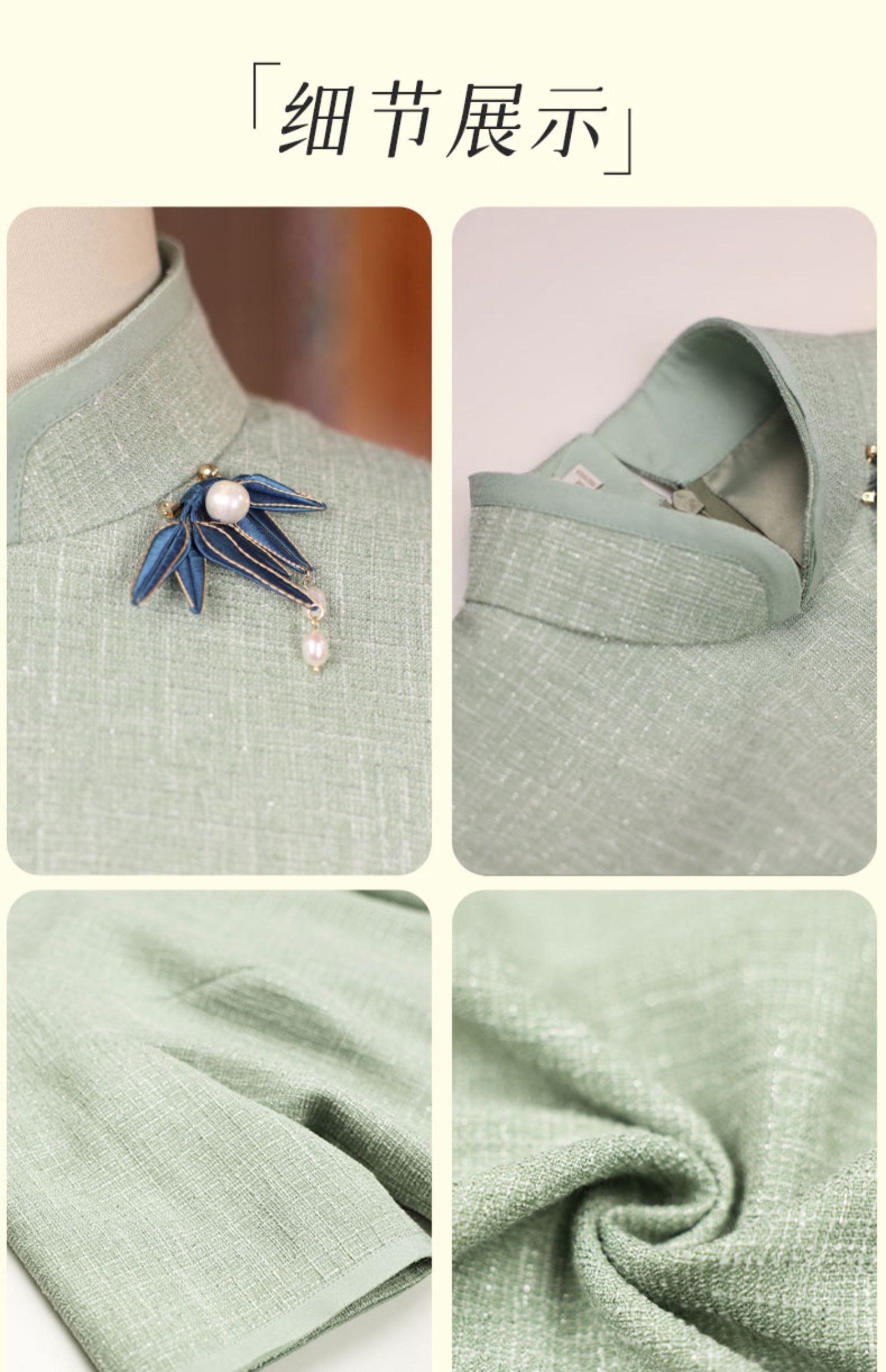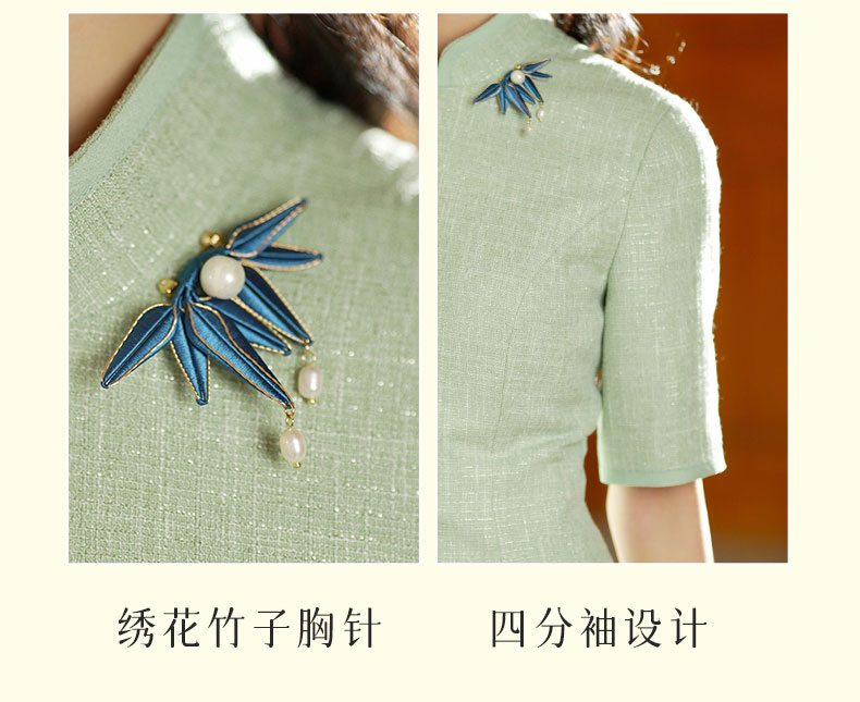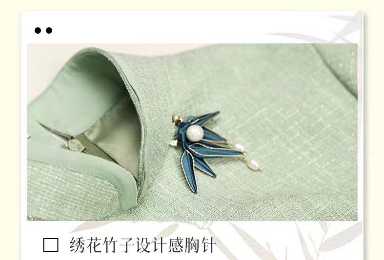 搭配竹子胸针:整个裙子以清新淡雅为基础 ,给人整体感觉会很清新脱俗,气质的感觉,如果在搭配一些小饰品在领口处,会显得更加精致,更加显气质。这个胸针可谓是裙子的点睛之笔。