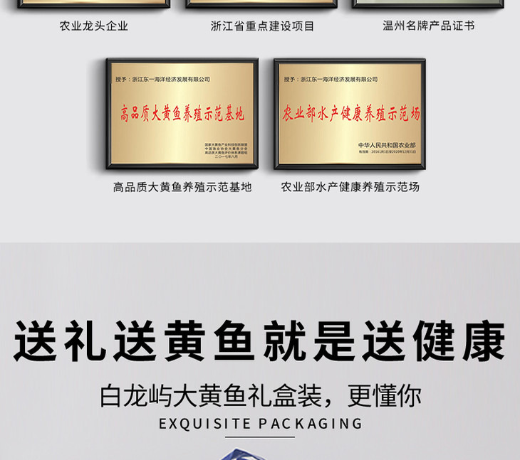 2、产品荣誉:①农业农村部无公害农产品、②中国有机农产品认证、③中国地理标志共用品牌、④温州名牌产品、⑤温州瓯越鲜风公用品牌、⑥浙江省农业博览会金奖、⑦中国福州国际业渔博览会金奖等荣誉称号、⑧首届温州市生态大黄鱼品质评比第一名。