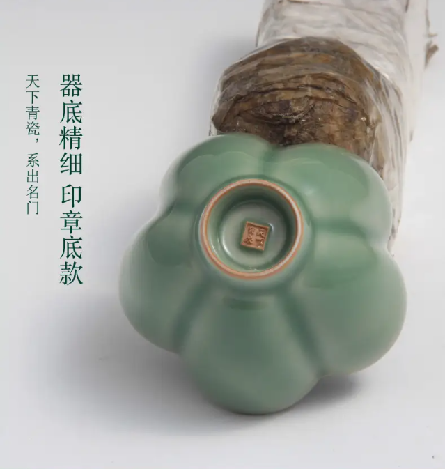 龙泉窑青瓷花口杯的设计灵感来源于南宋龙泉窑花口杯。该器物造型别致,宛如一朵待放的花蕊,它内外施清釉,釉色青白光洁,釉质肥厚滋润,是龙泉窑中的精品。