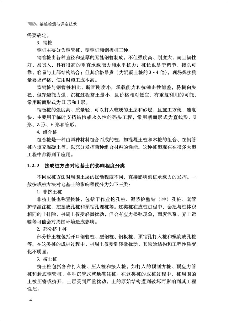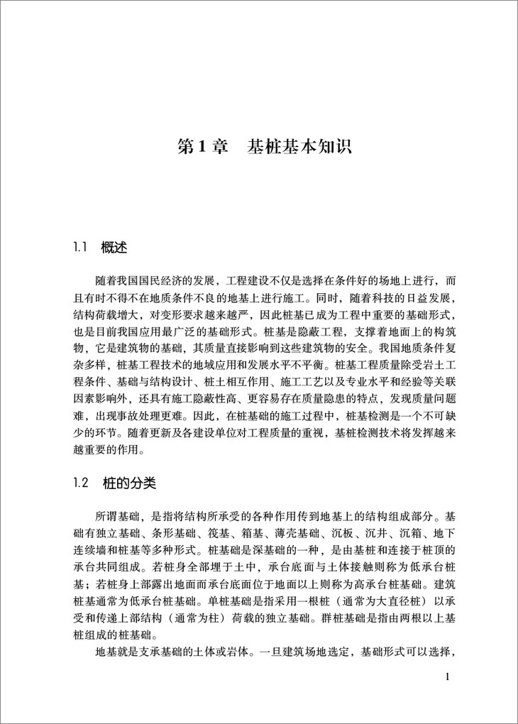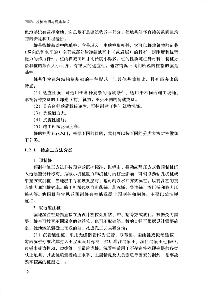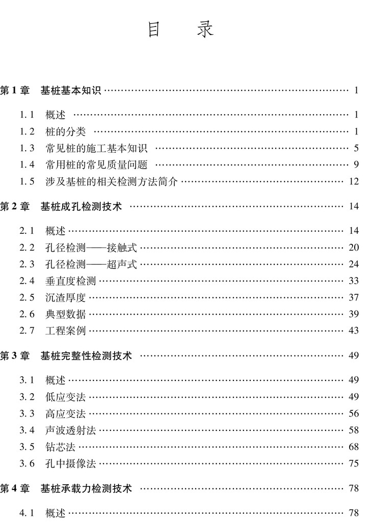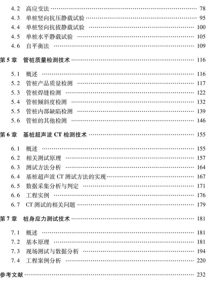 全书针对基桩现场检测人员的实际需求,对规范中应用比较成熟的方法和技术只做简单介绍,更注重新技术和新方法的介绍。在基础理论方面以基本够用为原则,阐明基本概念、基本原理和基本检测技术,取消或弱化了对部分理论公式的推导。本书除了介绍基桩的基本知识、基桩完整性检测方法、基桩承载力检测方法等基本内容外,还介绍了基桩成孔质量检测、基桩超声波CT检测技术、桩身应力测试等内容;针对成桩过程中的质量控制,本书重点介绍了成孔质量检测技术;针对在沿海地区应用比较广泛的管桩,本书详细介绍了管桩各环节的检测与测试技术;针对既有建筑的基桩,本书结合现行行业标准,重点介绍了几种既有建筑基桩的检测方法。
