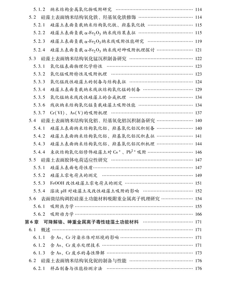 本书系统介绍了硅藻土矿物成因、微观结构、物理化学属性,以及独特吸附净化、吸声降噪、助滤/过滤功能。从硅藻土应用需求及有效提高吸附效能角度,着重介绍了硅藻土表面微结构调控、活性基元担载、纳米结构氧化物原位沉积制备全过程;并对硅藻土功能化的方法与机理进行解析,有助于深入感知、探索利用硅藻土环境净化功能。本书技术性强、实用;既深层次介绍硅藻土,又力求简单易懂,为其规模化、工业化应用提供可借鉴信息。