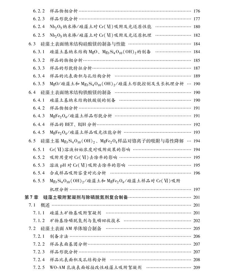 硅藻土表面微结构的调控、活性基元担载、纳米结构金属氧化物原位沉积等可有效提升硅藻土作为吸附剂的吸附效能(吸附容量、吸附速率、污染物去除率和性价比),这也是研究工作者所要追求的目标。本书作者与研究生团队开展了硅藻土表面微孔结构和活性组分重构的系统研究,有效提升了硅藻土后继衍生制品的技术经济性,取得的研究成果已进行工程应用,为硅藻土功能材料的规模化应用提供了技术支持。