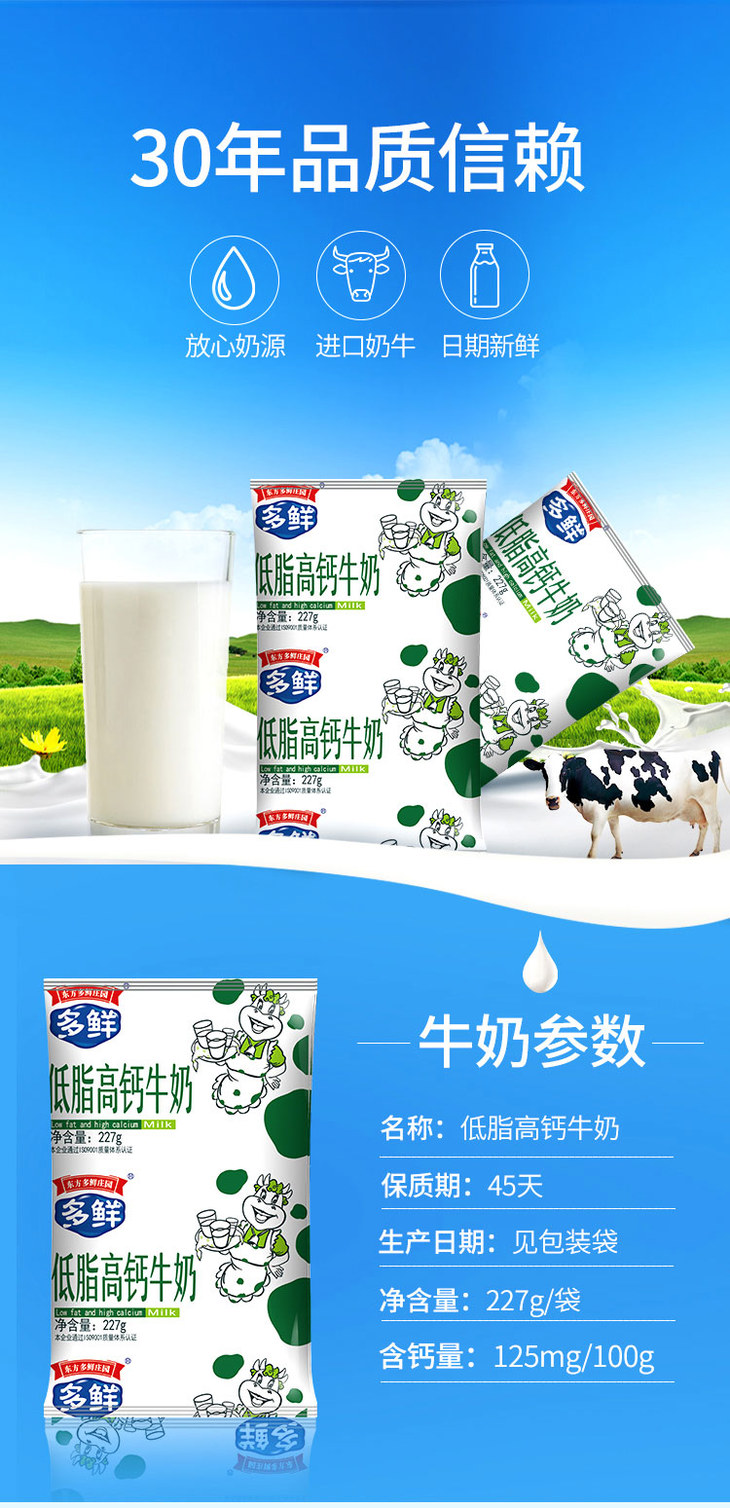 【热卖】多鲜低脂纯牛奶 低脂利乐枕包装灭菌乳227g*16袋