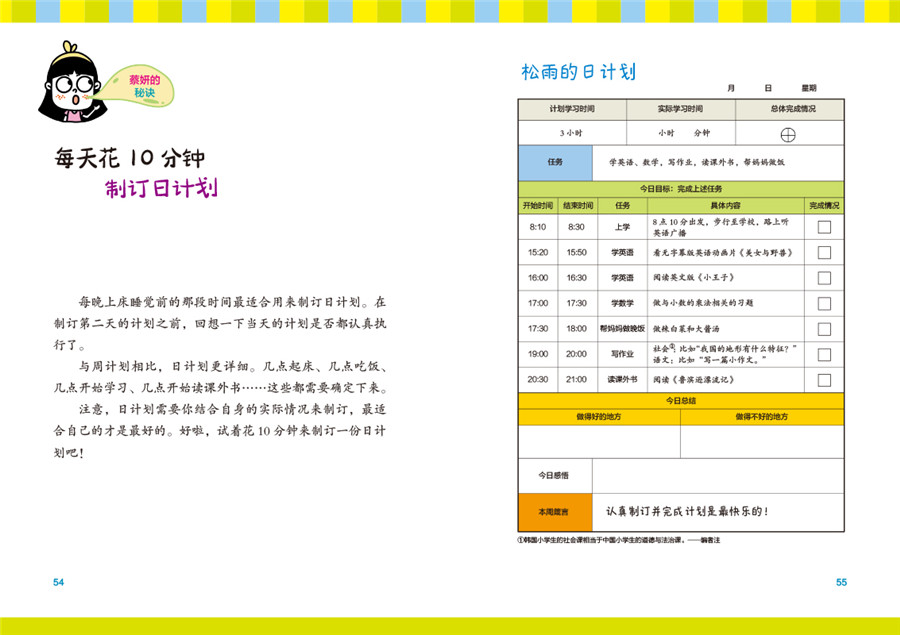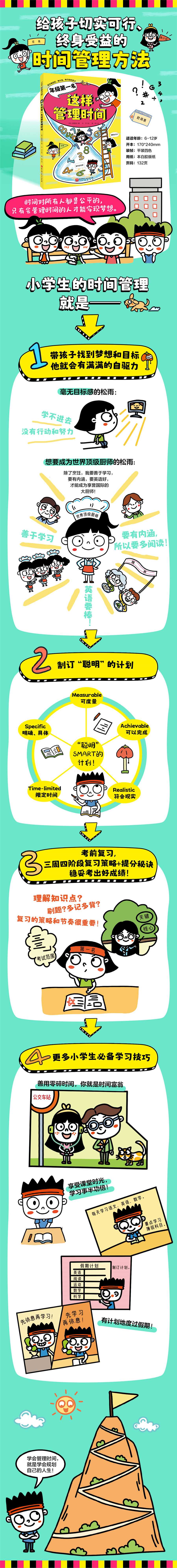孩子一升入小学,时间就明显不够用了。语数英三门课,每一门都得紧紧跟住,更别提任务量和任务难度还在逐年提高。如果孩子没有形成一套好的学习习惯,没有建立起高效率的学习方式,就会越来越吃力。本书作者发现,很多优等生在时间管理和学习方法上有着相通之处。为了让更多孩子摆脱低效、疲劳的学习状态,本书提供了高效的学习计划和学习方法,让孩子体验到学有所得的乐趣,获得优异的成绩,同时能拥有更多自由时间去发展爱好,从而拥有丰富且充实的小学生活。本书包含日常学习计划、备考计划、假期充电计划等,给孩子切实可行、终身受益的时间管理方法和学习技能。书里的主人公松雨很想学出好成绩,却总是觉得时间不够用。她向成绩优异的春天、建学和蔡妍询问时间管理方法,才发现他们都制订了;聪明的学习计划,并且成功完成了计划。好的时间管理方法和学习方法换来的不只是更优异的成绩,还能建立孩子对学习的兴趣和自信,促成学习进步更有动力继续进步的良性循环。