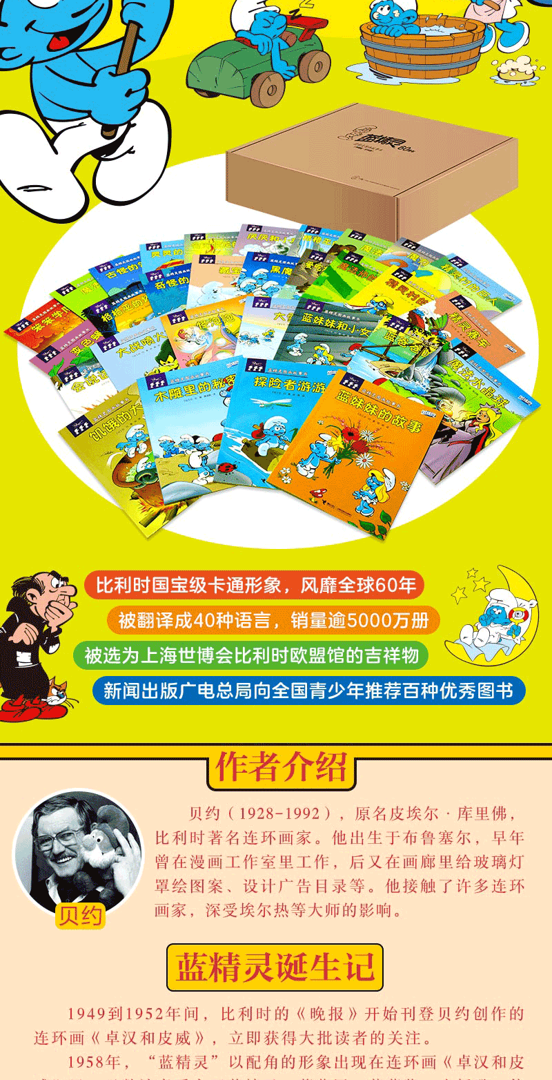 贝约(1928-1992),比利时漫画家,原名皮埃尔·库里佛,他的小侄子一直发不清“皮埃尔”这个音,为了省事干脆叫他贝约,他就把“贝约”当成了自己的笔名。1958年创作的蓝精灵以配角形象出现在他的连环画《卓汉和皮威》故事里,深受孩子们喜爱,于是他开始专为这些蓝色小人创作连环画。之后,这些三个苹果高的蓝色小精灵风靡全球,渗透到人们生活的方方面面,漫画、动画片、电影、现场秀、主题公园以及各种玩偶,蓝精灵的形象足足吸引了几代人。尤其是蓝精灵图书的影响力更是持久和深远,被译成25种文字,销售超过2500多万册,改编动画在60多个国家播出。