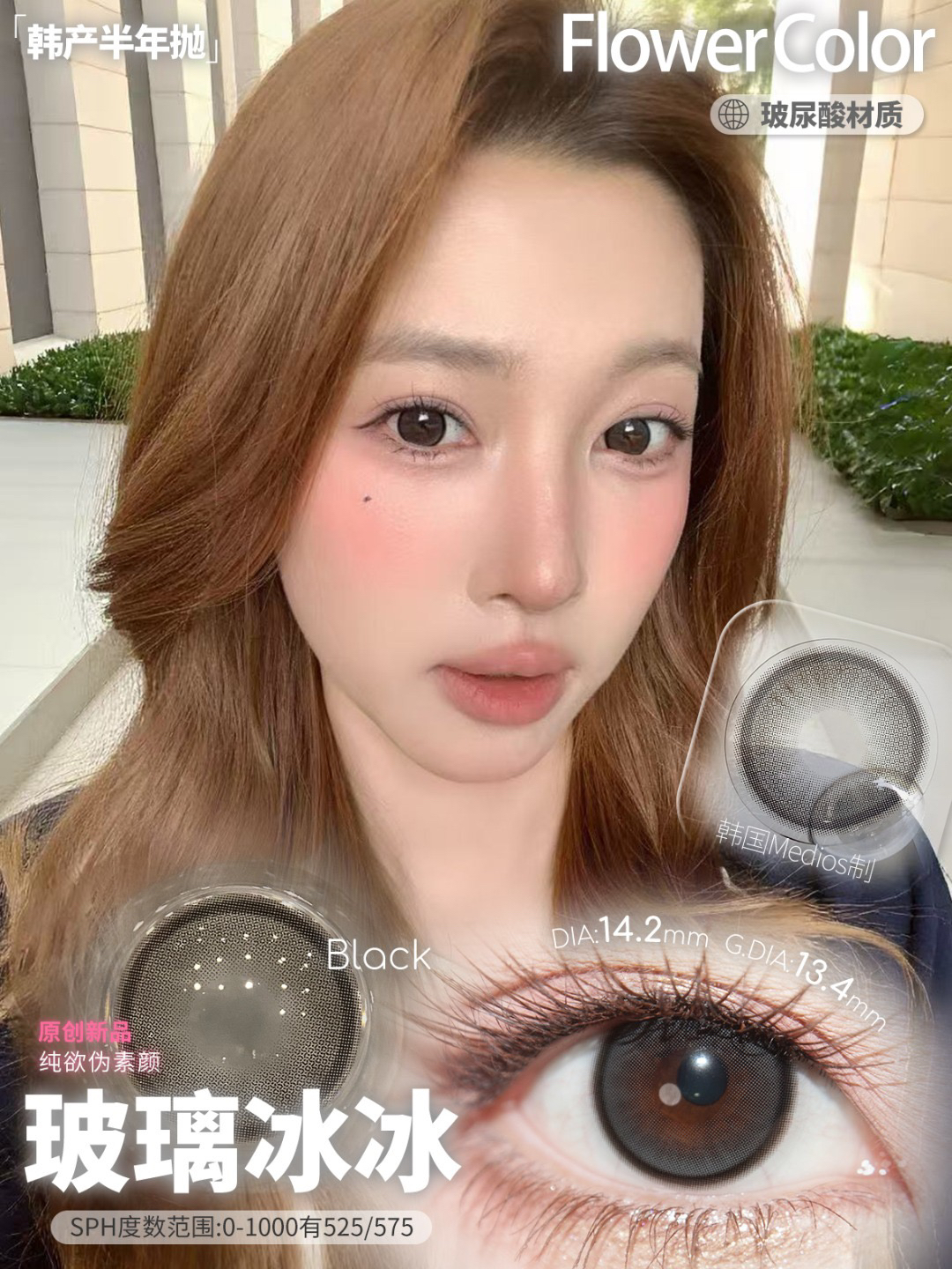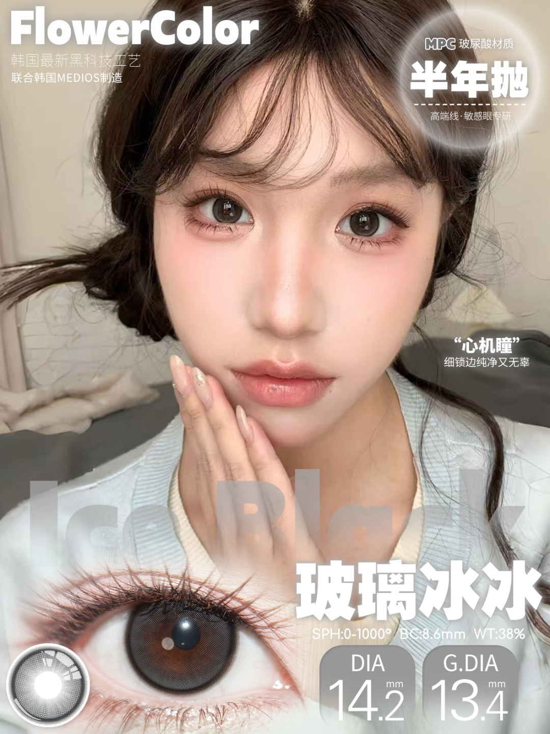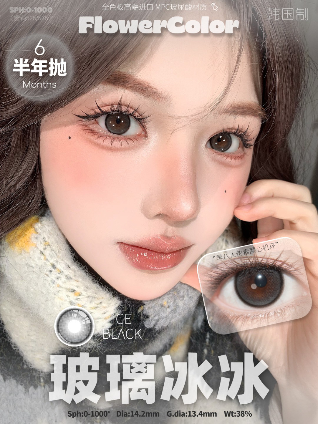 标注直径:14.2mm着色直径:13.4mm含水量:38%佩戴期限:半年型(建议6个月)可配:0-800度(无525/575)工厂:韩产icodi含硅水凝胶