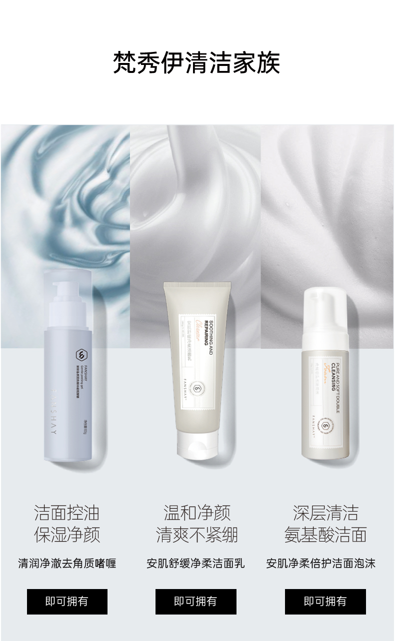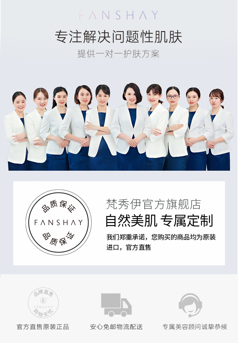 梵秀伊(FANSHAY),为女性肌肤问题提供专业性的综合解决方案,从根本上调理肌底层细胞,并坚持以天然植物萃取精华。产品以草本植物为重点,取中草药之精华,辅之现代高科技提纯技术,让肌肤由内而外深层改善