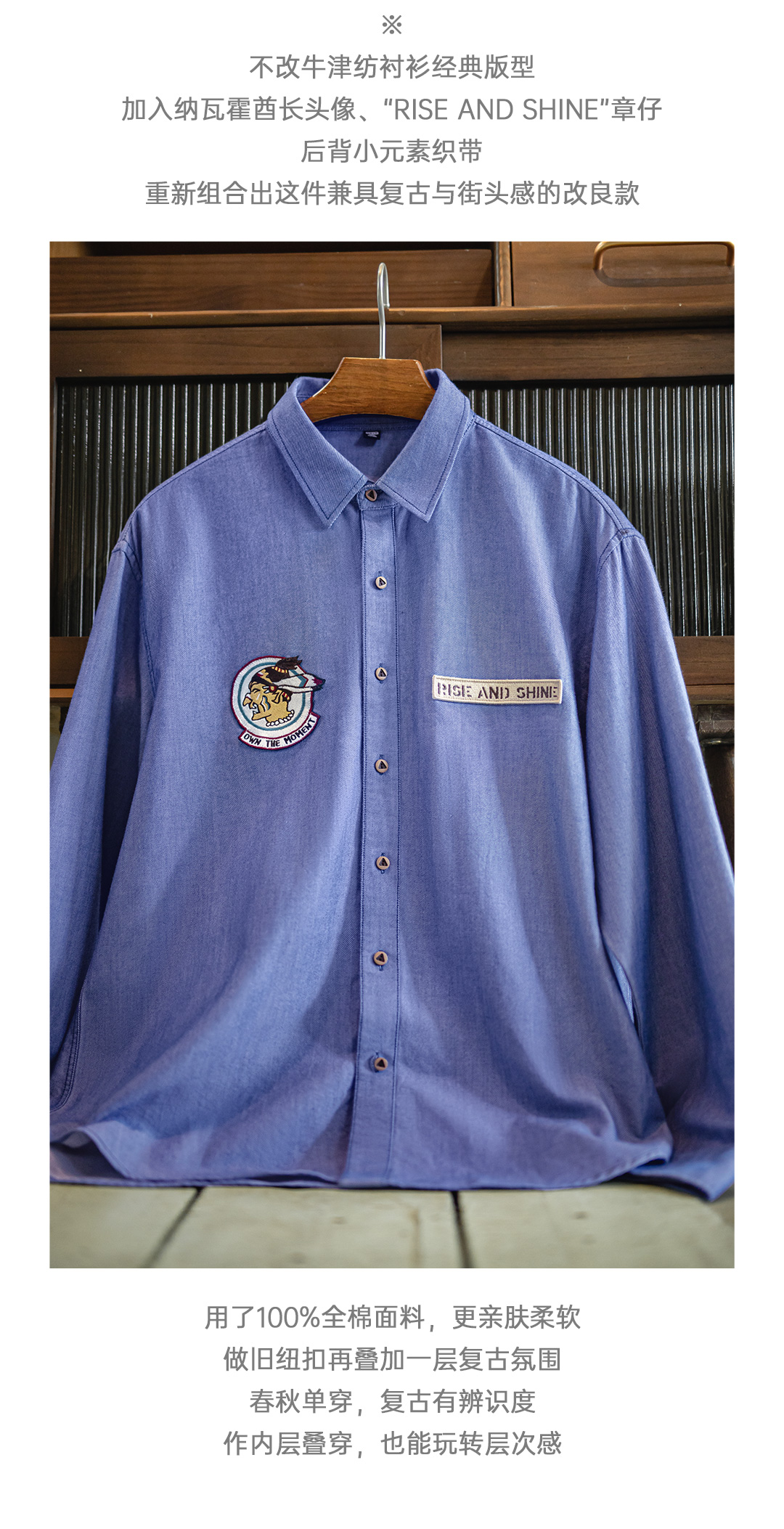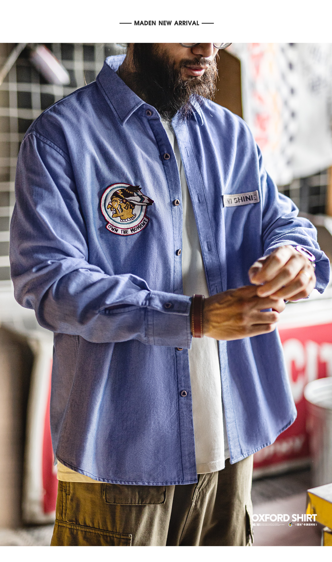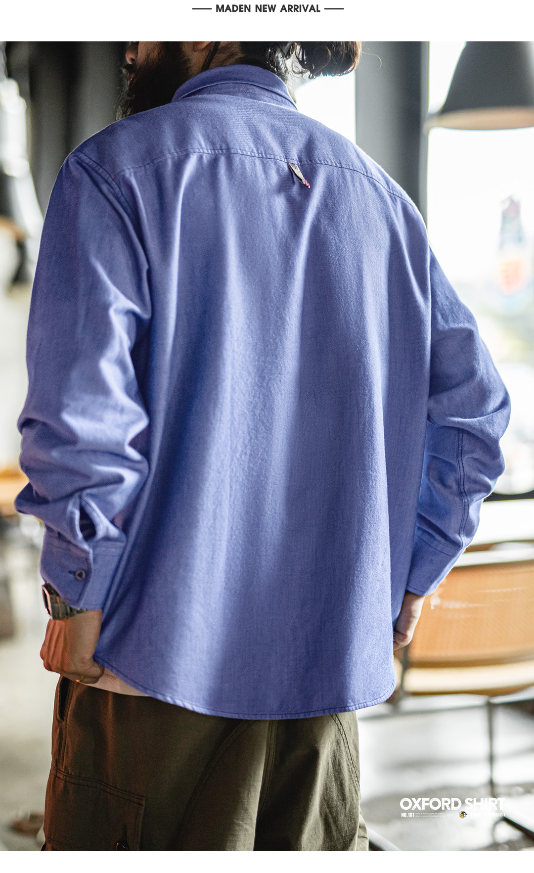 马登工装美式休闲牛津纺长袖衬衫蓝色衬衣外套纯棉牛津布薄款男秋