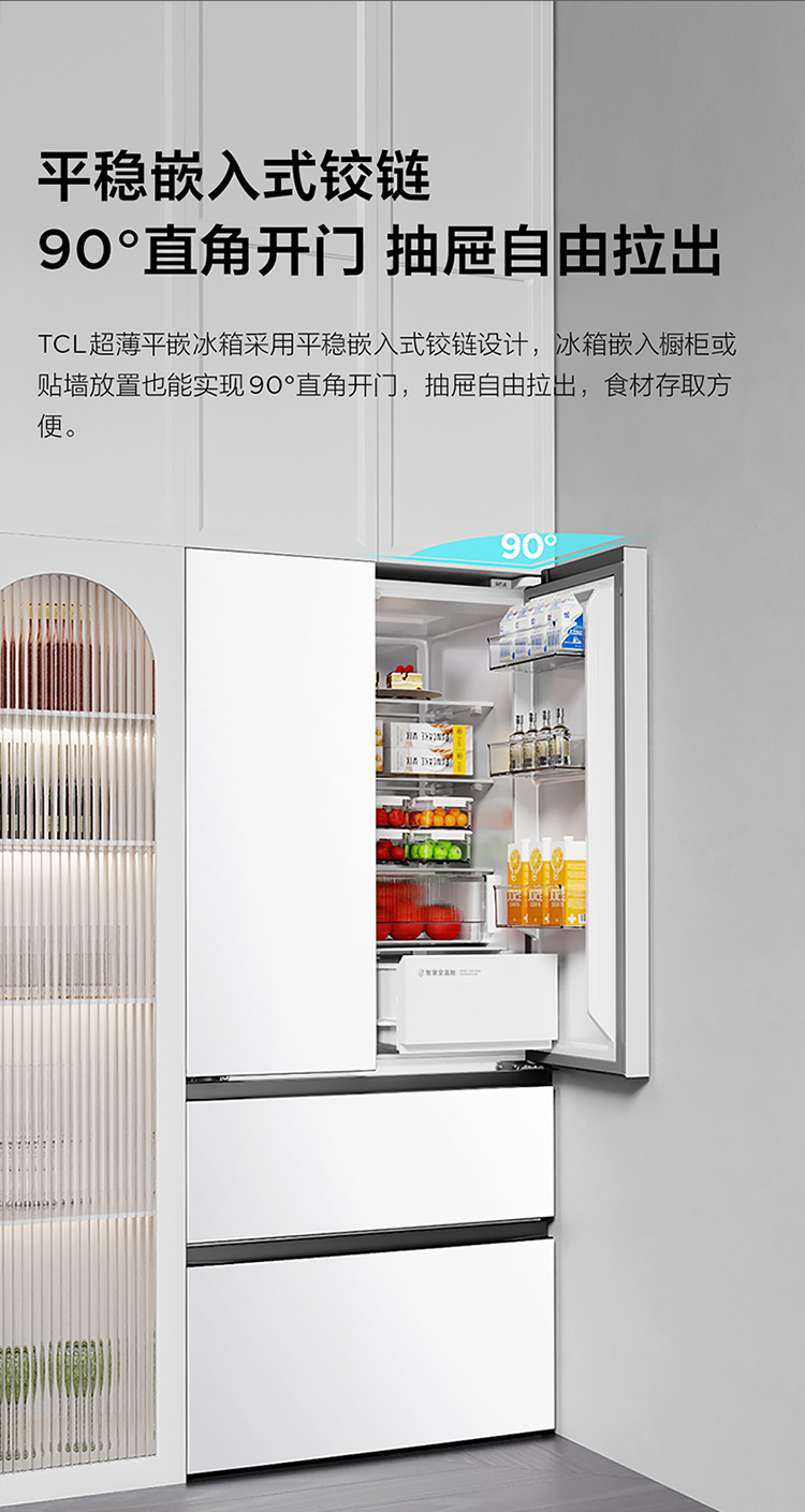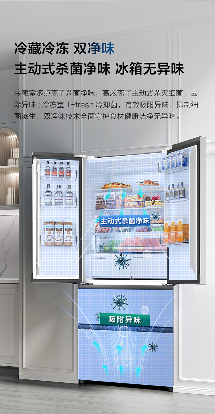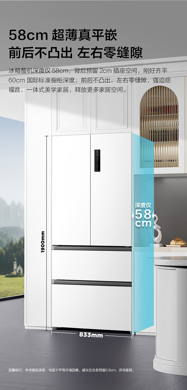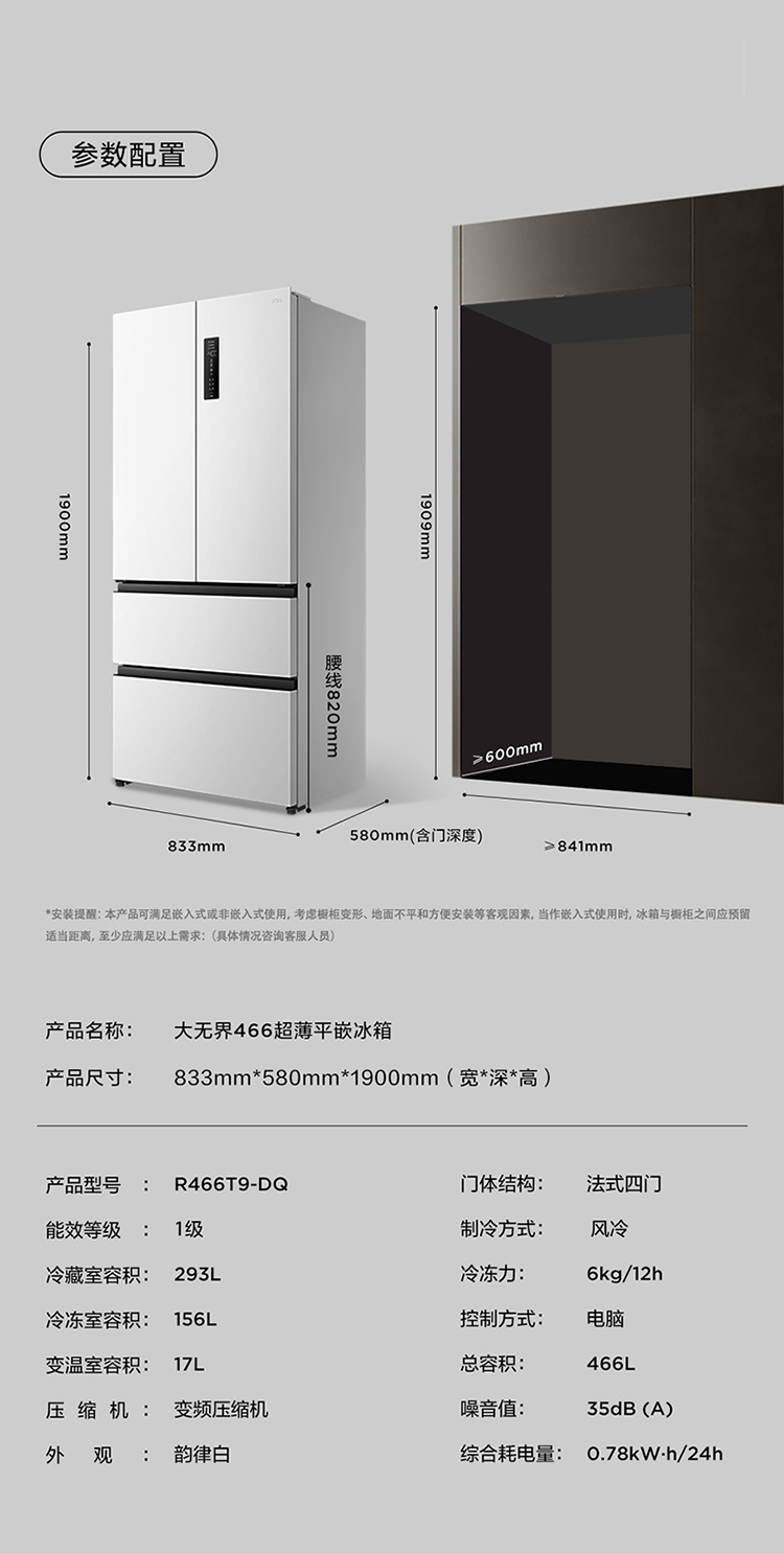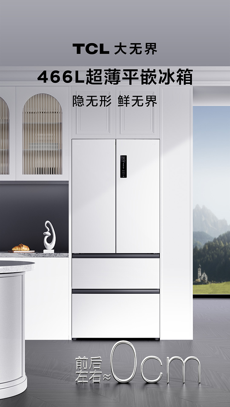 TCL大无界466升T9法式多门四开门58cm超薄零嵌入式底部散热双净味冰箱 R466T9-DQ