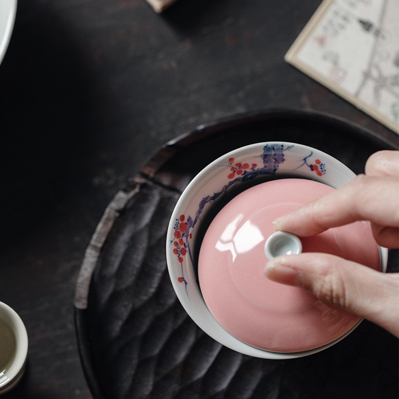永利汇凤仙粉精工釉下粉彩杏露手绘盖碗三才碗功夫茶具泡茶碗手工