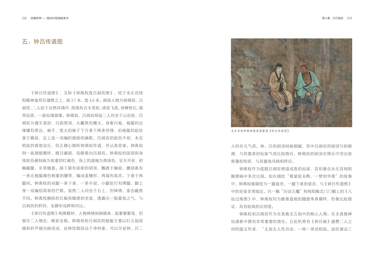 在叙事上,作者突破文献叙事的局限,立足道教发生学视角,直面学术难题,将先秦龙虎蚌塑、玉龟、玉琮等“先秦神明”纳入开篇,融合“图像道教”与“文献道教”的研究视角,凸显图像作为历史叙说者的原生价值,既展现了专业的学术思考,也让道教美术这一专业领域的知识变得易于理解,助力读者窥见中国道教美术史的精要,感受读图的愉悦与学术的温度。