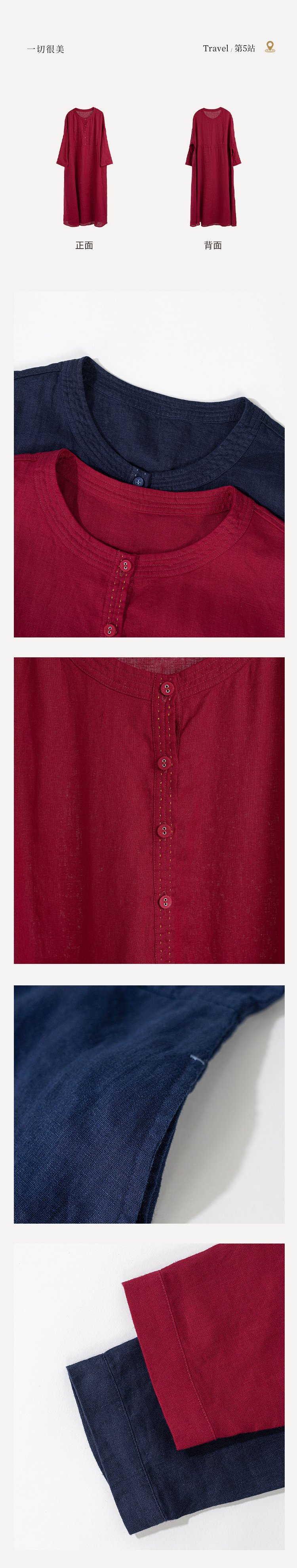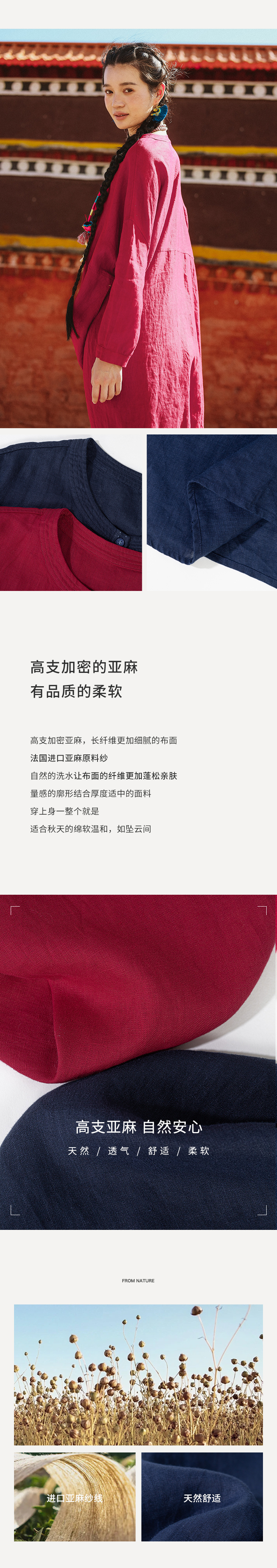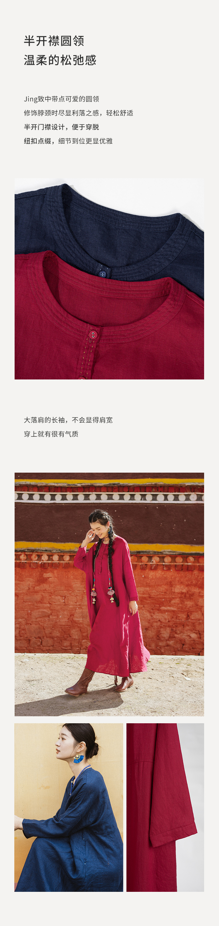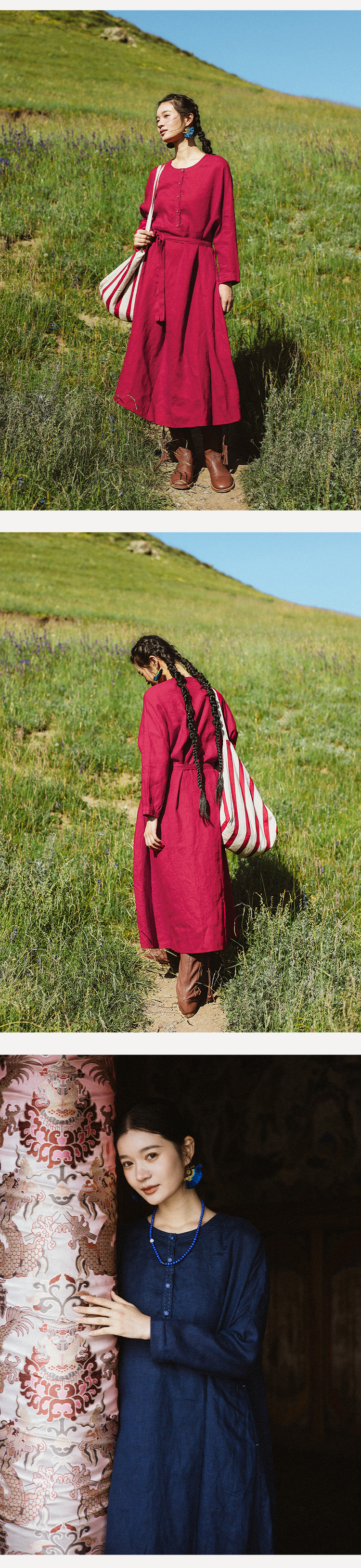 * 绽放641朵/高原多巴胺高支亚麻系带A摆宽松半开襟圆领长袖连衣裙