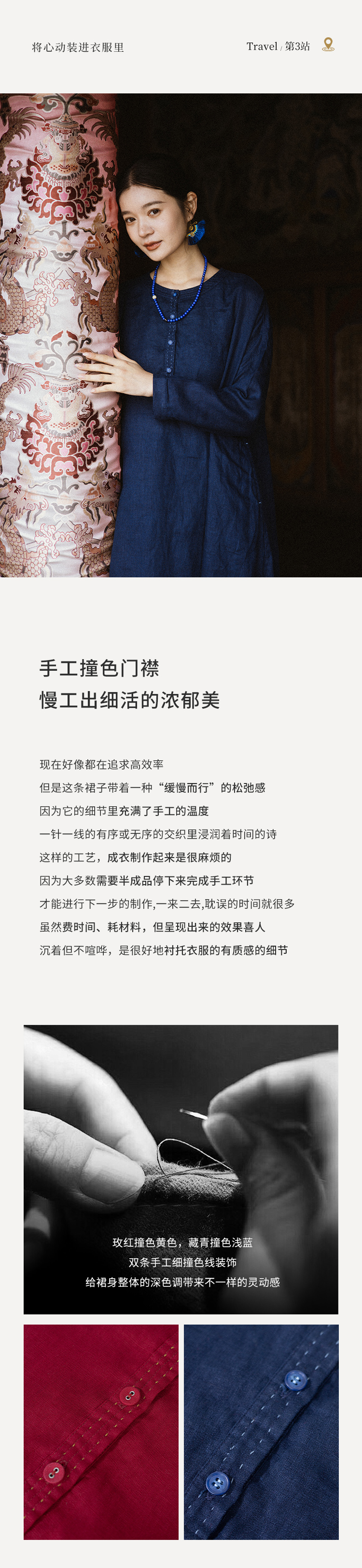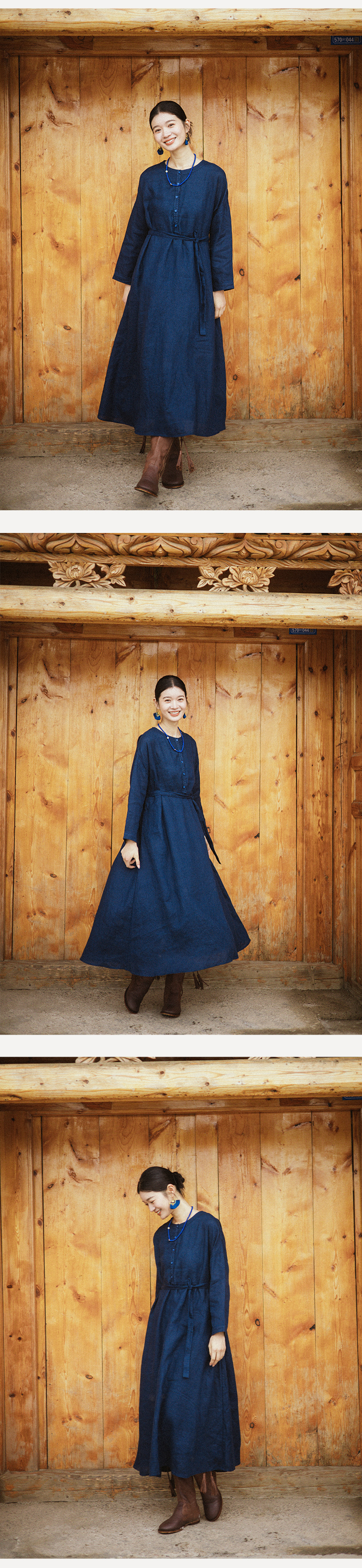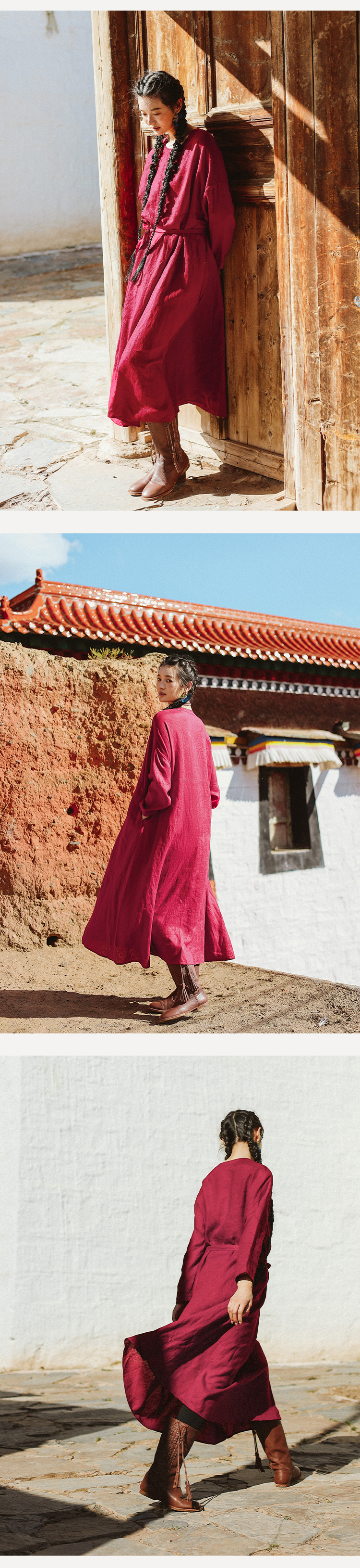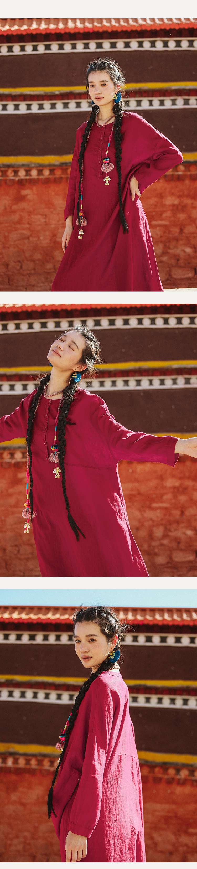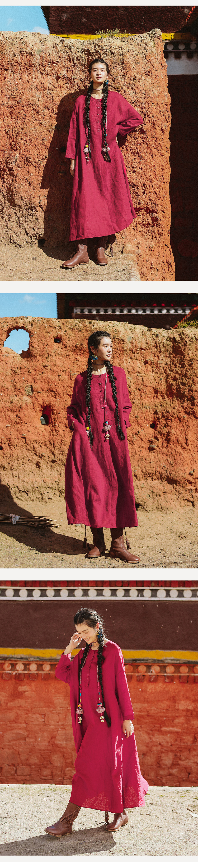 * 绽放641朵/高原多巴胺高支亚麻系带A摆宽松半开襟圆领长袖连衣裙