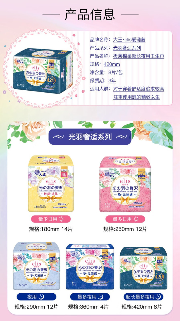 大王夜用卫生巾光羽奢适系列极薄绵柔8片*420mm 易好