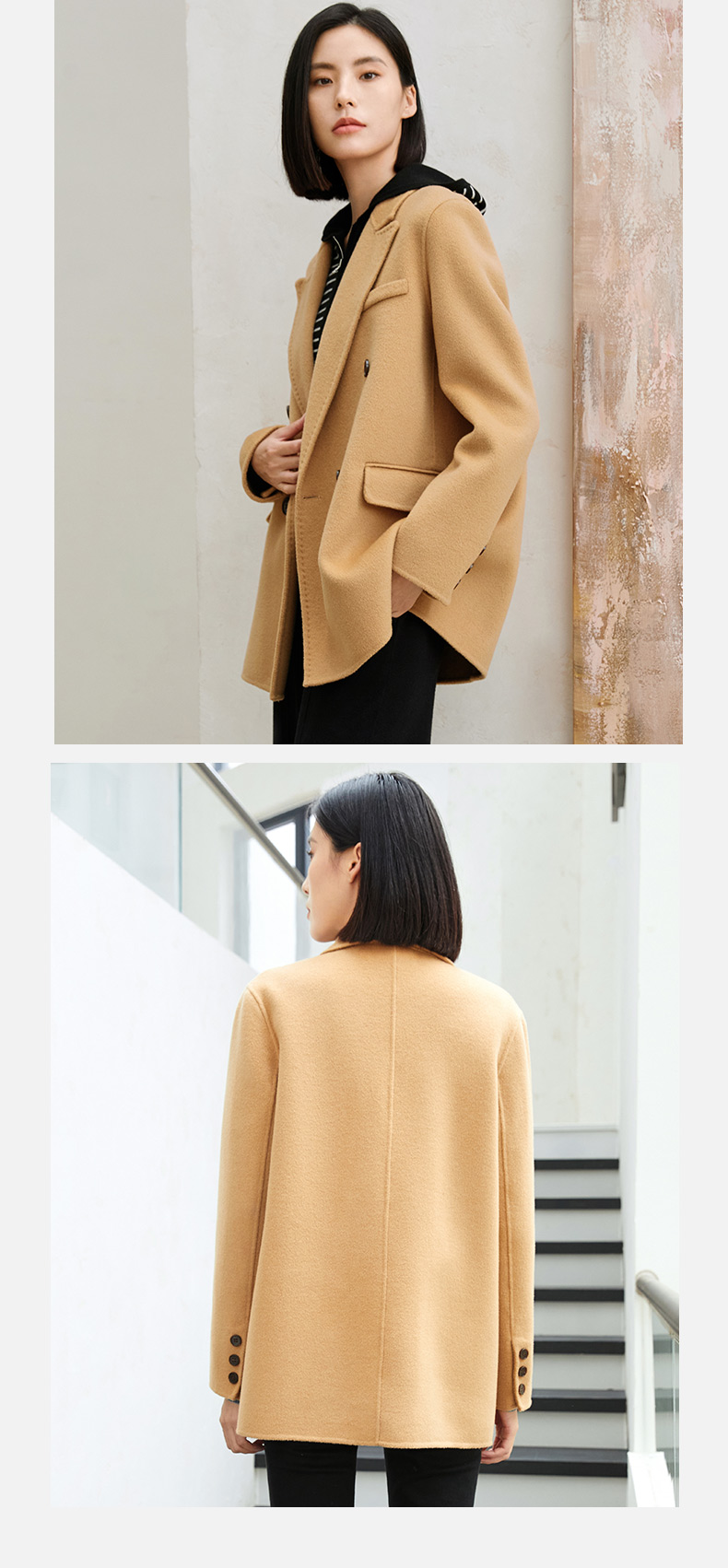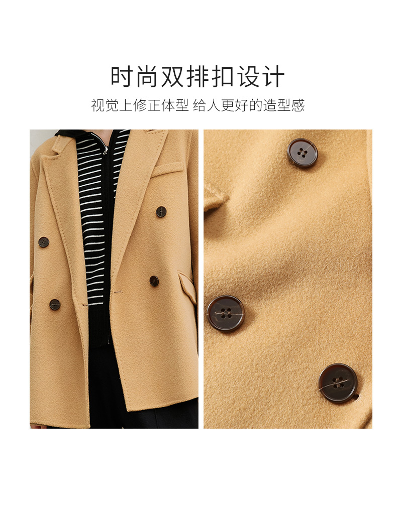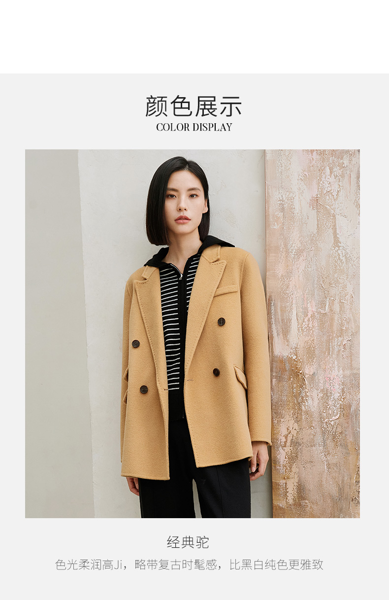 玳莎女装2023年冬季新款绵羊毛双面呢双排扣驼色西装通勤气质外套 DD37305