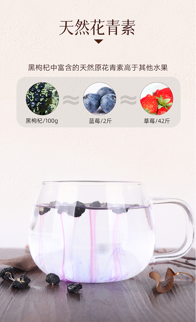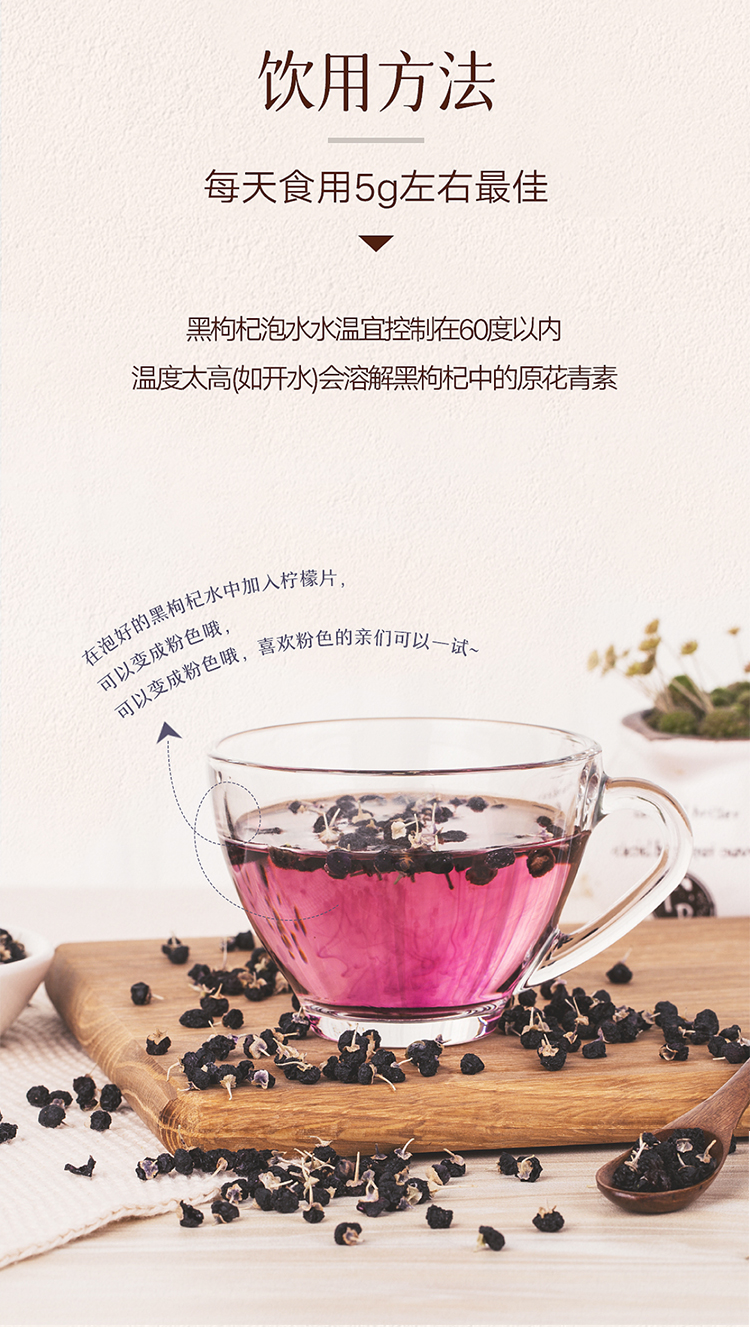 【食用方法】成年人每天3-6克黑构杞泡水,自来水冲泡呈蓝色(碱性矿泉水冲泡呈紫色(中性水)直接饮用。冲泡5-6遍,黑杞中的有效营养物质)全部浸出,直至水变为白色为止。也可以配菜