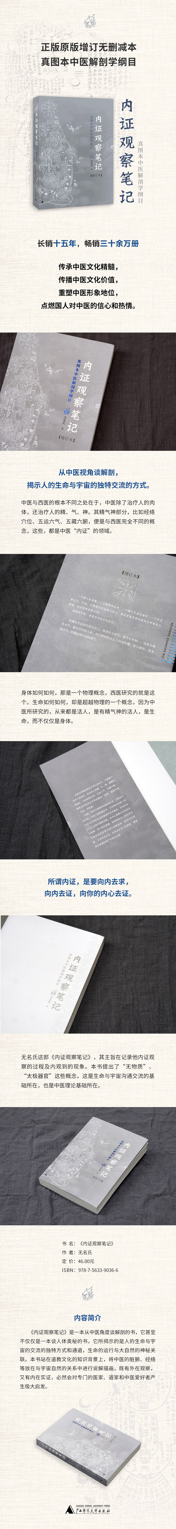 这是一本从中医视角谈解剖的书,它甚至不仅仅是一本谈人体奥秘的书,它所揭示的是人的生命与宇宙的交流的独特方式和通道,生命的运行与大自然的神秘关联。《内证观察笔记(真图本中医解剖学纲目增订本)》以道教文化和知识为背景,将中医的脏腑、经络等放在人体生命与宇宙自然的关系中进行说解描画,既有外在观察,又有内在实证,必然会对专门的医家,道家和中医爱好者产生极大启发。