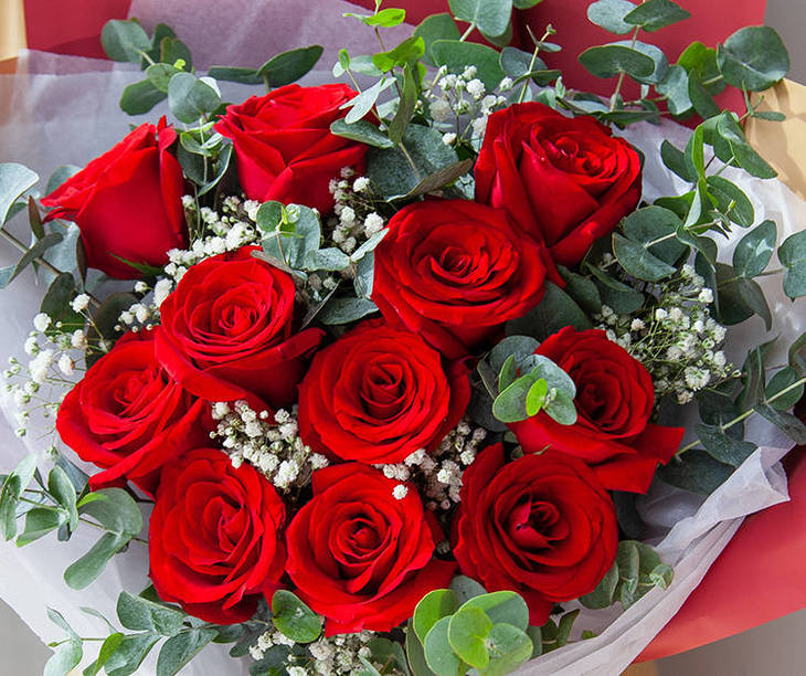 材料 卡罗拉红玫瑰11枝、白色满天星3枝、尤加利10枝