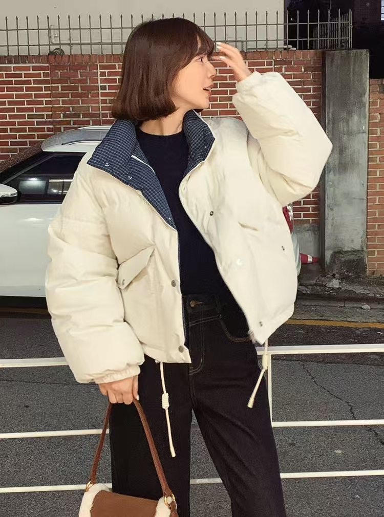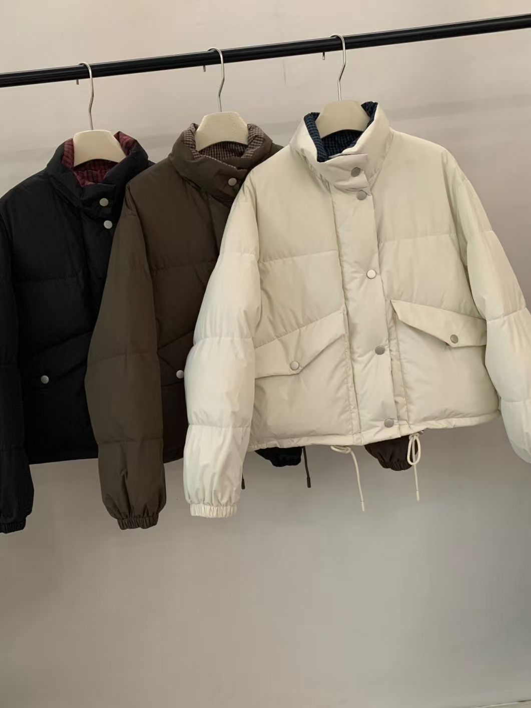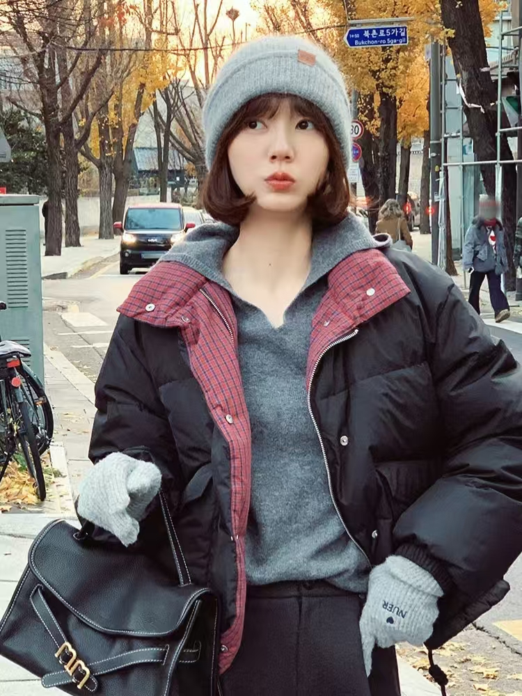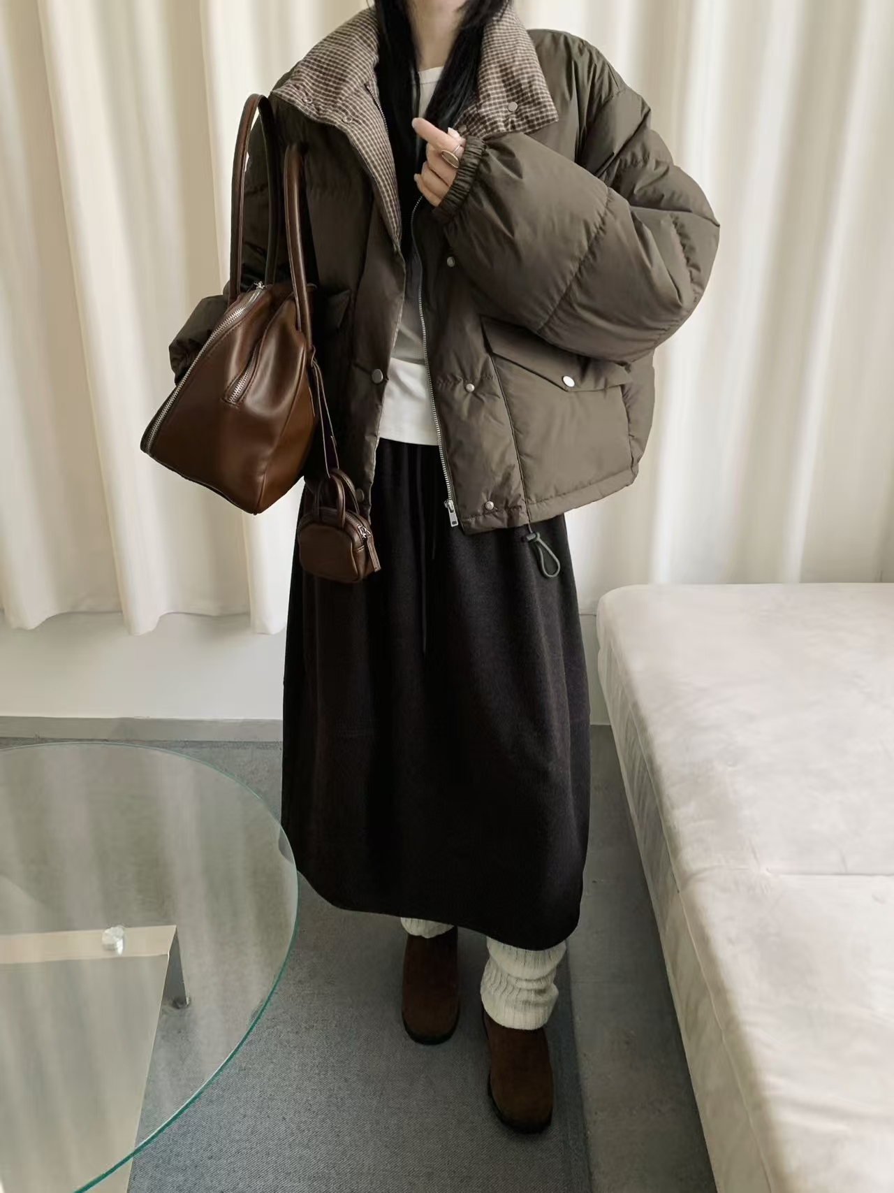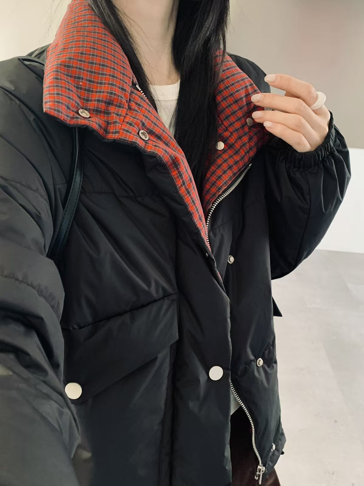 [特价]韩系格子撞色羽绒服 竖领设计款 90白鸭绒羽绒服 黑色/暗绿色/米白色2510023
