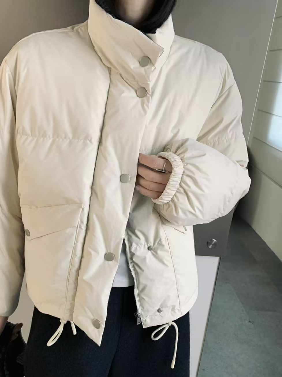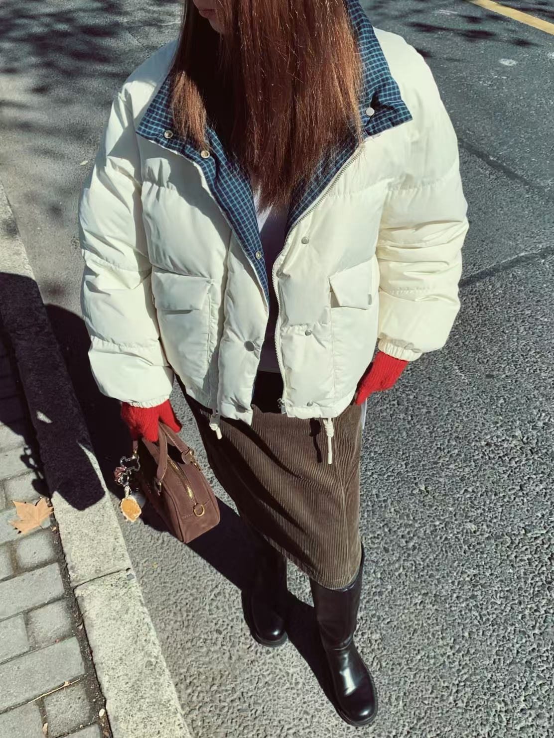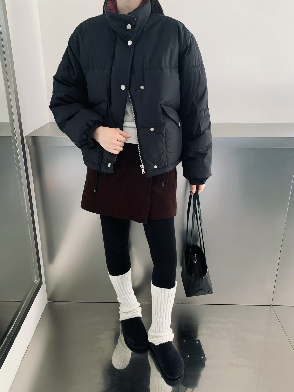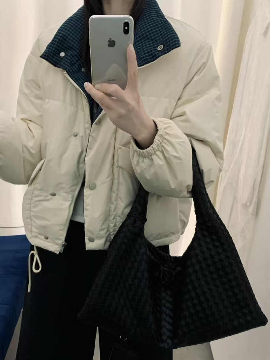 [特价]韩系格子撞色羽绒服 竖领设计款 90白鸭绒羽绒服 黑色/暗绿色/米白色2510023