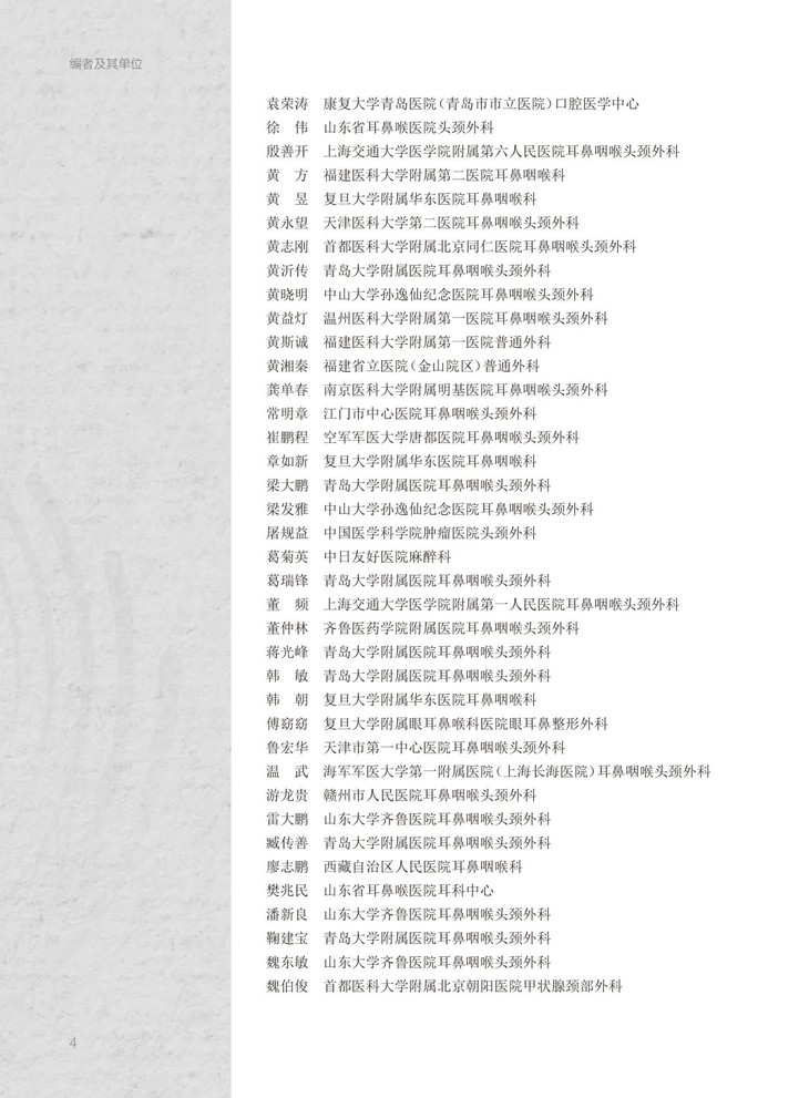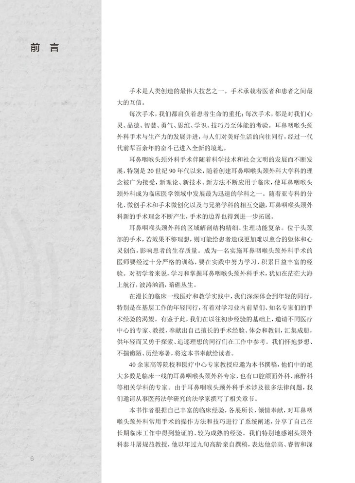 本书对常用耳鼻咽喉头颈外科手术做了较为详细的介绍,对大多数医疗机构尚未开展的手术、处于初步探索中的手术未予介绍。编者在讲解每一种手术时,还进行了相关解剖学、围手术期处理和常见并发症等的提示,这些内容对手术至关重要,但由于篇幅所限和出于对读者已有知识储备的考虑,这些提示是提纲挈领、各有侧重的。