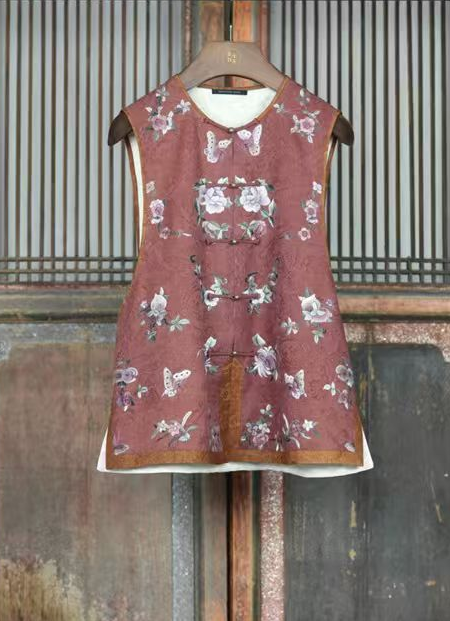 盛唐牡丹盛奢系列 | 蝴蝶花手绣真丝马甲-暗梅红