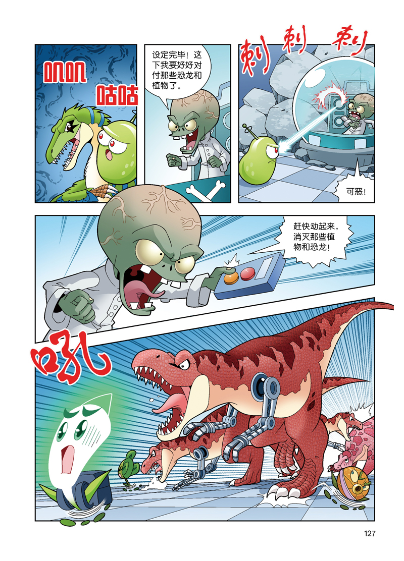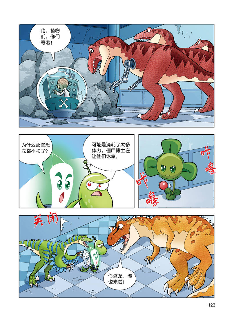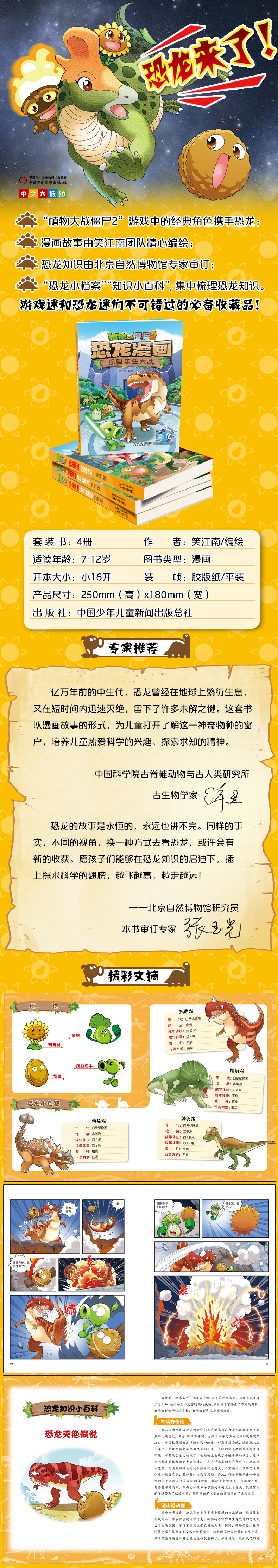 “植物大战僵尸2恐龙漫画第五辑”包含“植物大战僵尸2恐龙漫画”系列图书中的4册,将植物大战僵尸2游戏中的经典角色豌豆射手、菜问、坚果、红针花等带到遥远的中生代,与恐龙这一神奇生物联手,在一个个充满冒险与欢乐的漫画故事中,为小读者打开了解恐龙的一扇窗。<br>