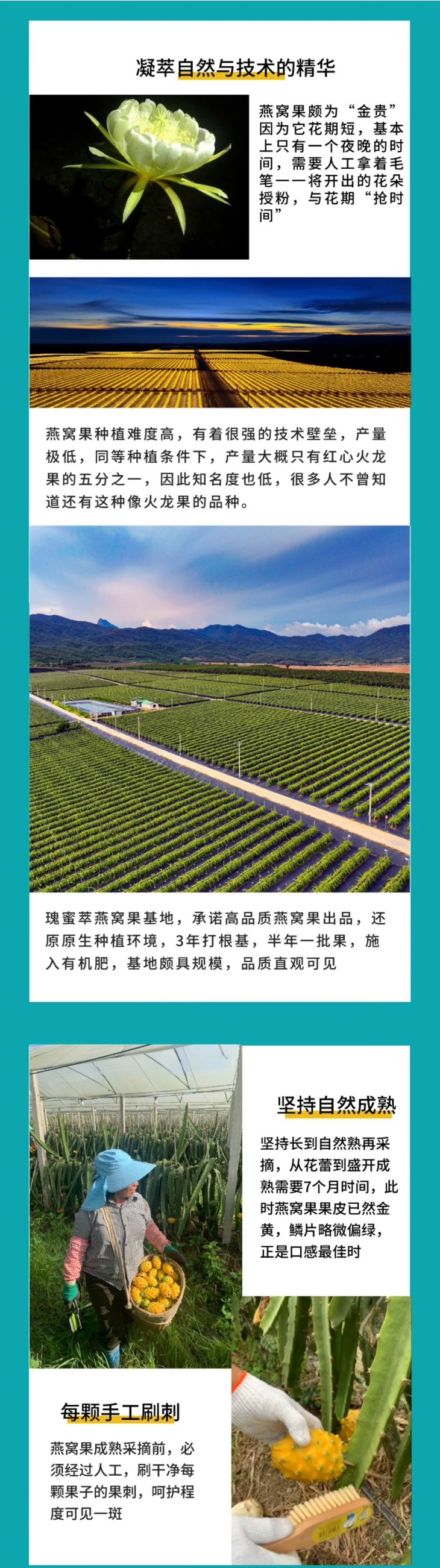 黄金燕窝果,来自海南三亚,有着3700亩自有原种苗种植基地,光热充足,远离城市污染。燕窝果的种植过程复杂,生长速度缓慢,对生长环境要求苛刻。从开花到结果,成熟需要3-6个月的时间,产量相对较低,不到火龙果的五分之一。但果园仍然坚持树上9成熟采摘,不打除草剂,不用膨大剂,确保果子的品质和口感。每天新鲜采摘,精心挑选,个头匀称饱满,品质上乘,是地道的燕窝果风味!