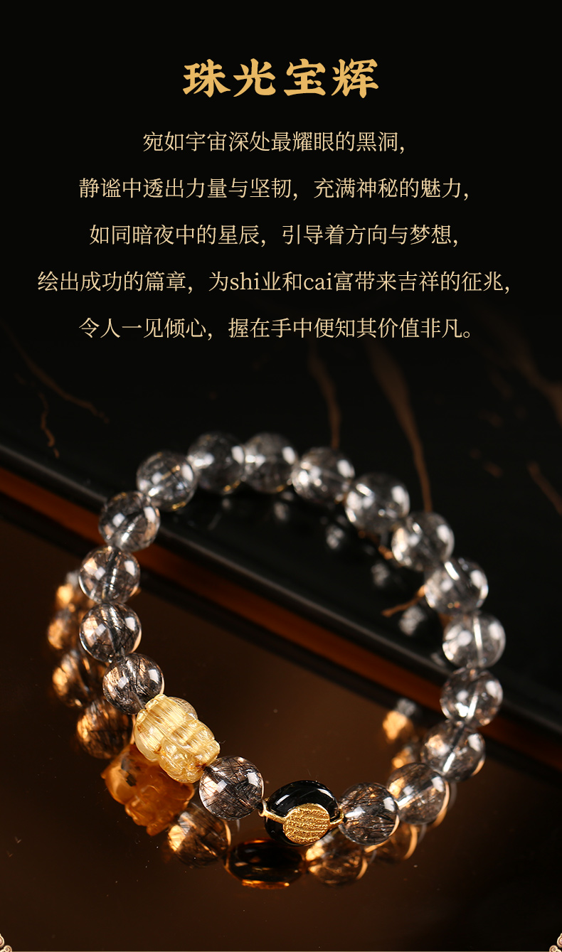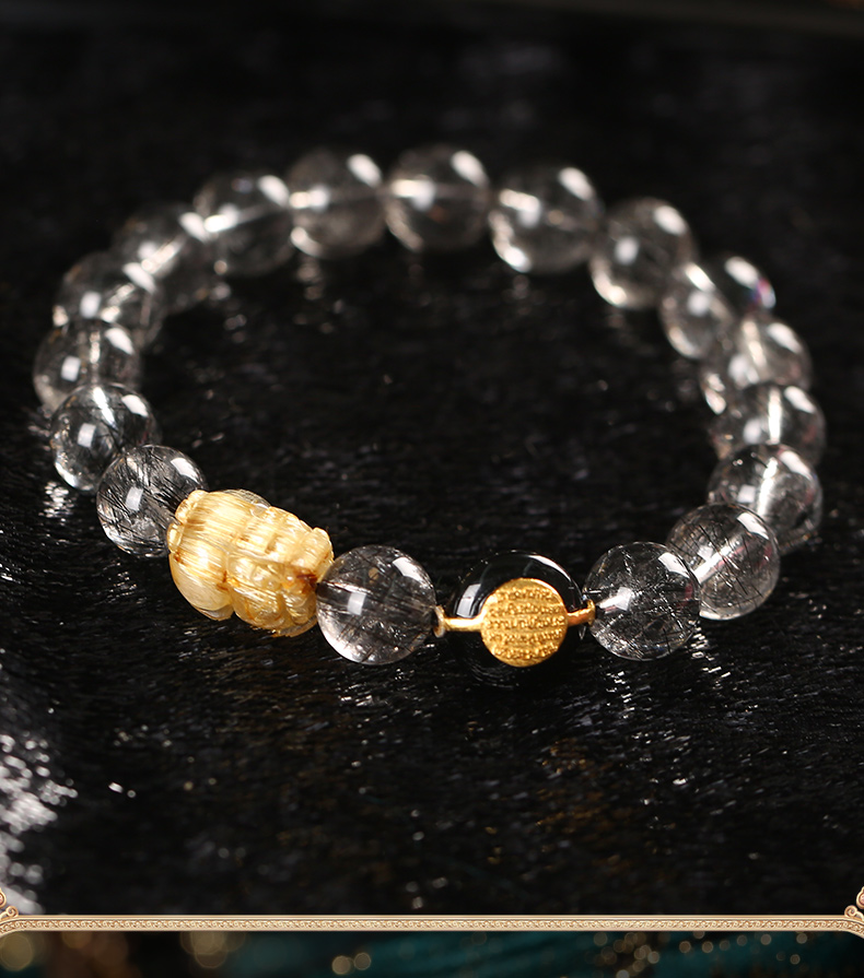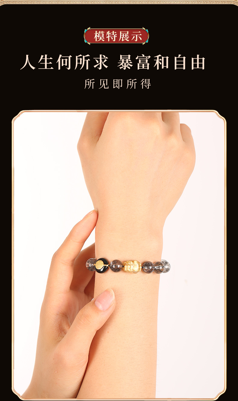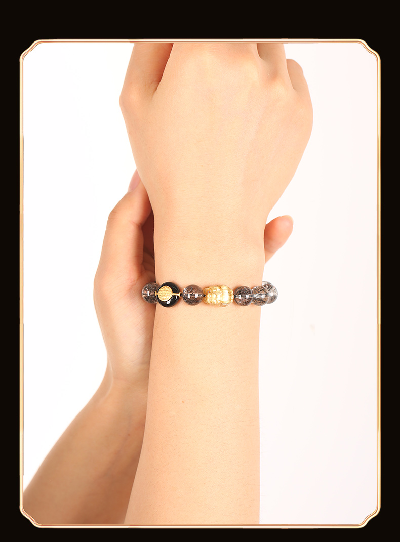 灵机生活馆 吉饰坊7A+黑发晶手链金发晶貔貅黑玛瑙水晶手串送礼