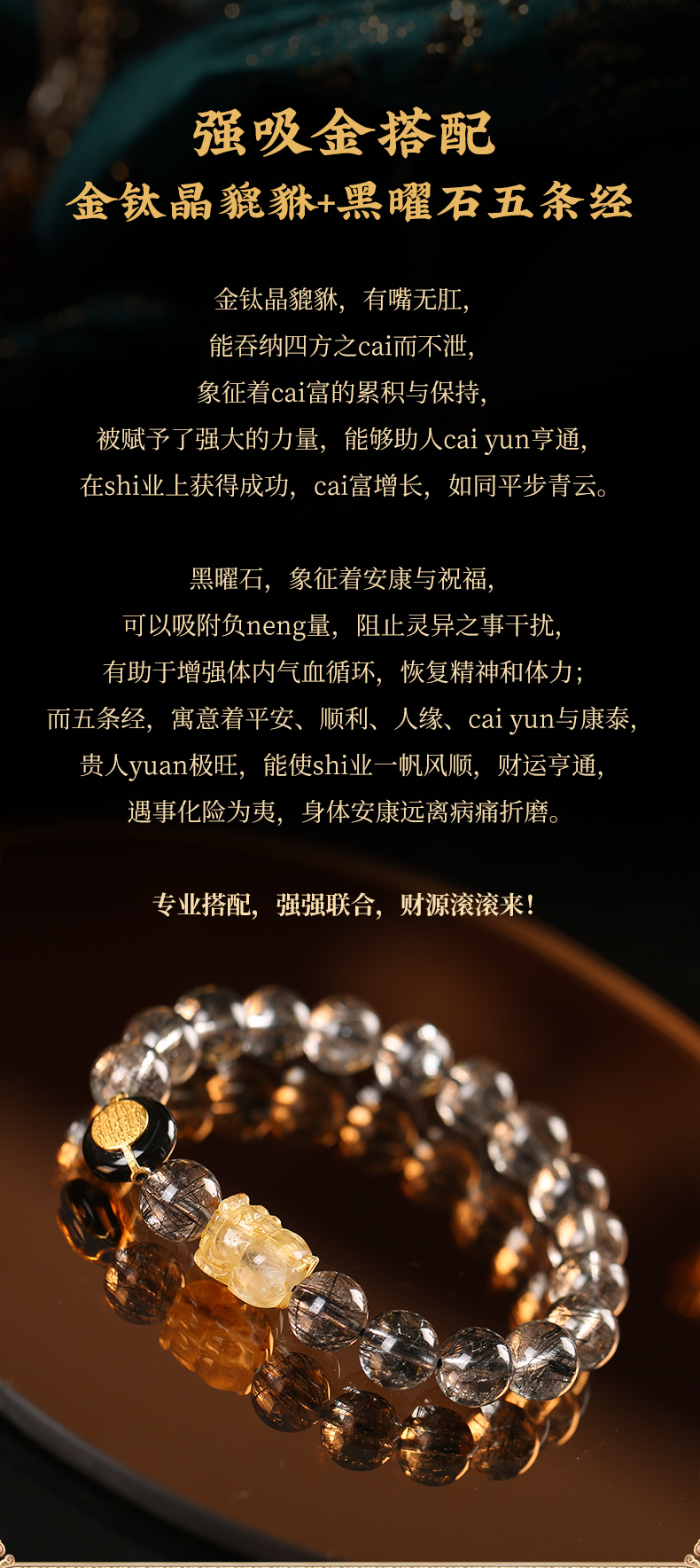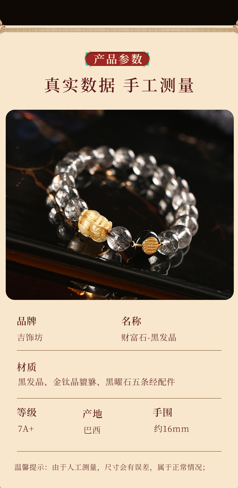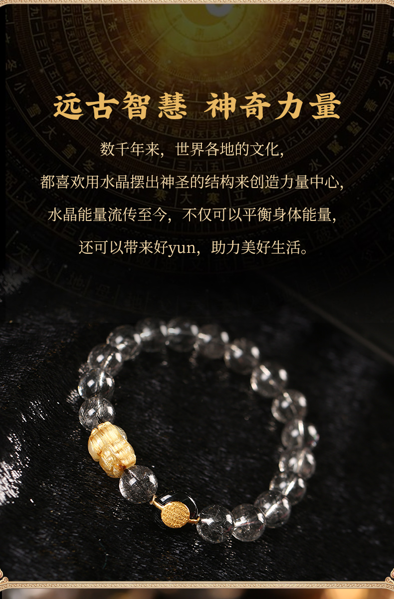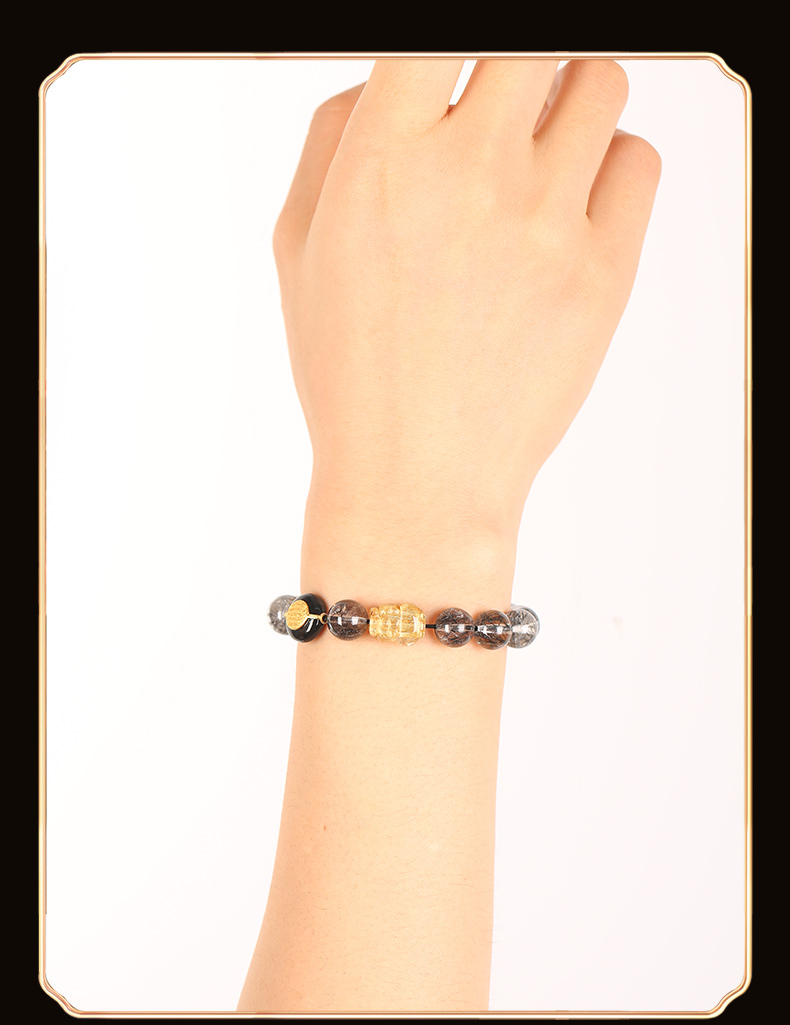 灵机生活馆 吉饰坊7A+黑发晶手链金发晶貔貅黑玛瑙水晶手串送礼
