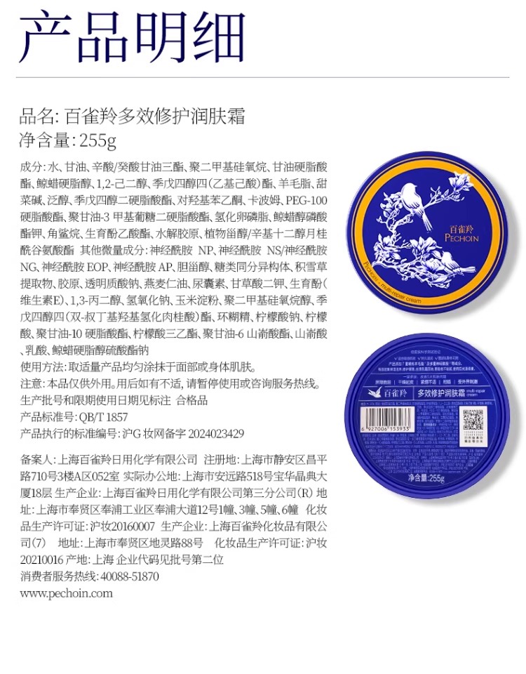 百雀羚 多效修护润肤霜 滋润保湿 面部身体可用 255g/罐