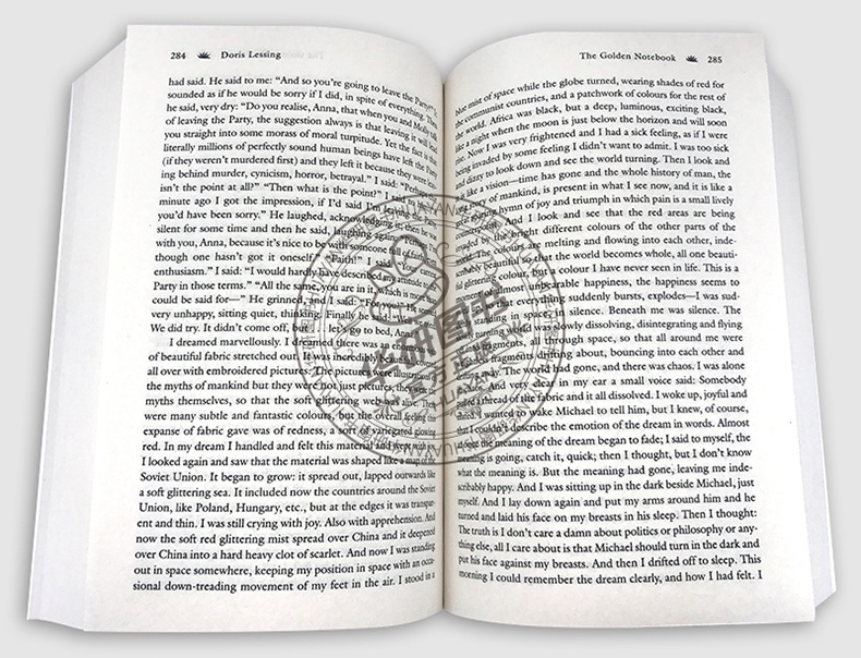 The Golden Notebook《金色笔记》这部小说先有一个轮廓,或者说框架,即《自由女性》,这是一部约六万字的中篇小说,可以独立成篇,但又分成五部分,被黑红黄蓝四本笔记的章节分隔开。四本笔记的作者是《自由女性》的主人公安娜·沃尔夫。她采用四本而不是一本笔记本记事,是因为她意识到有必要将笔记所记的内容逐一分开,以免引起混乱、无序,乃至精神崩溃。来自内部和外部的压力导致四本笔记的记事停止;结束处都画有一条粗粗的黑线。四本笔记的记录结束后,从支离破碎中产生了一部新的笔记,那就是《金色笔记》。