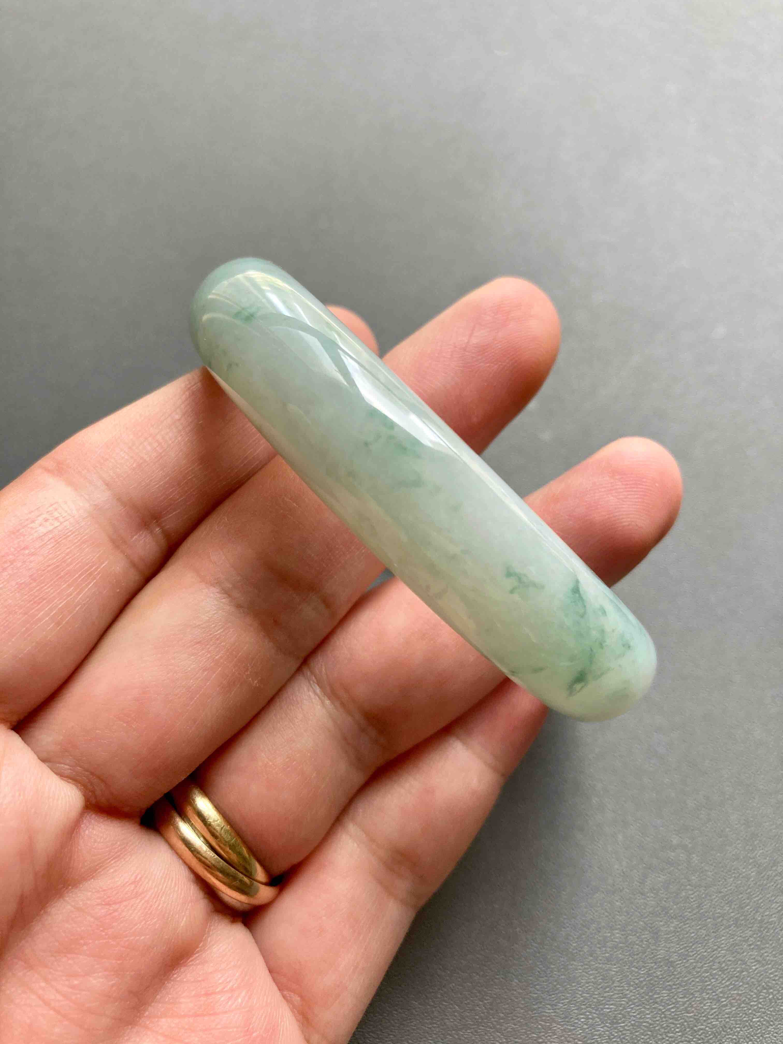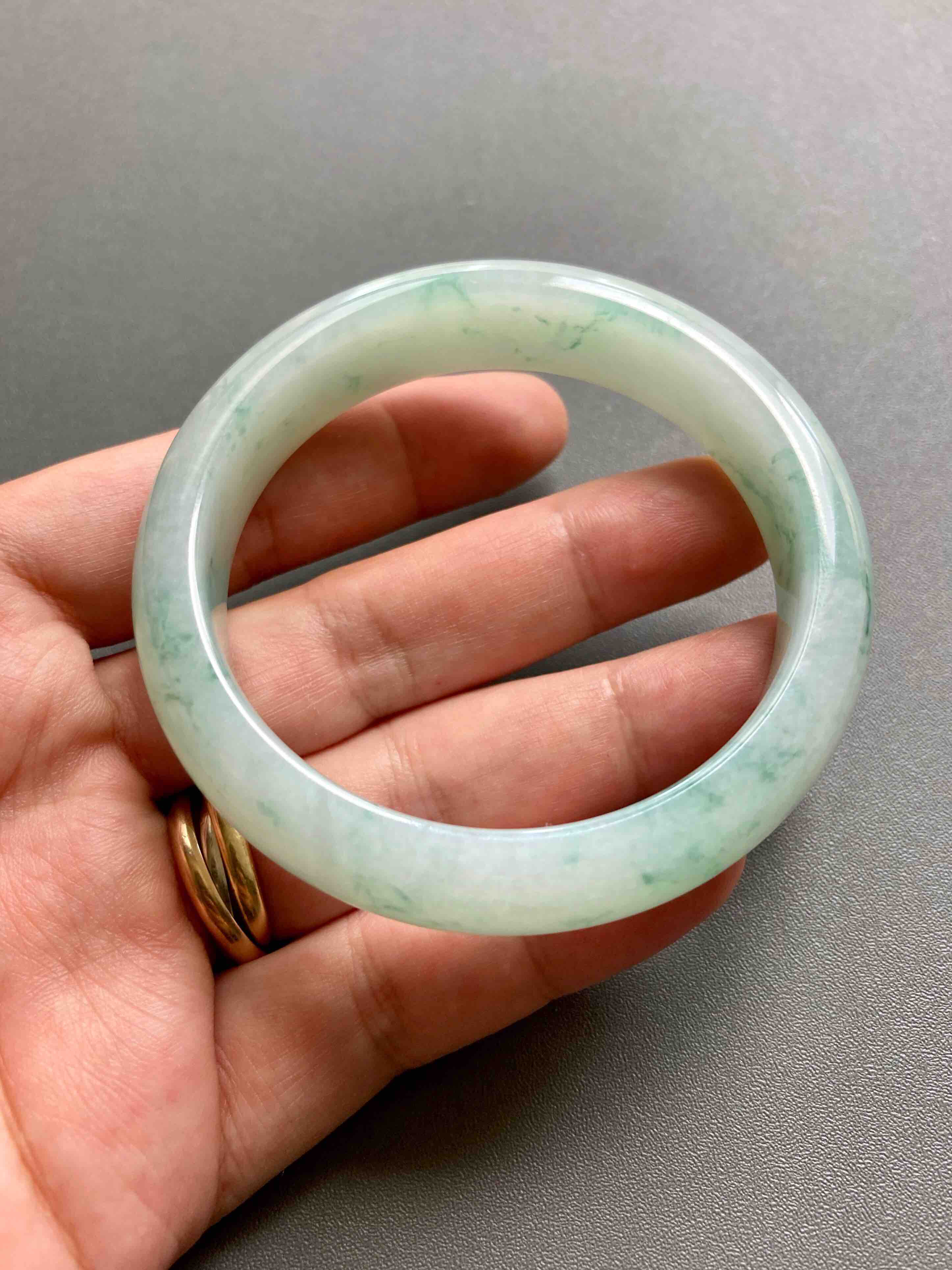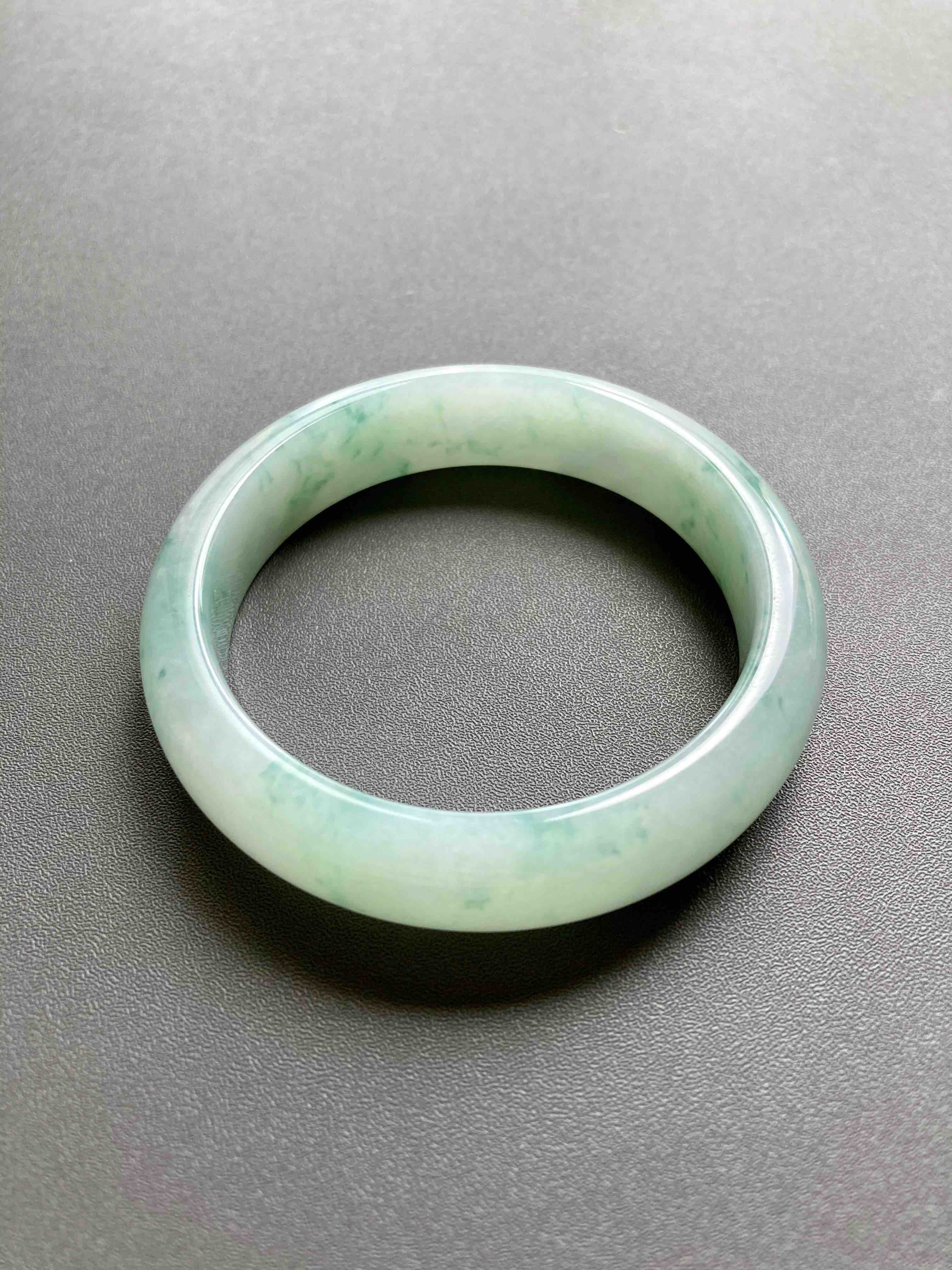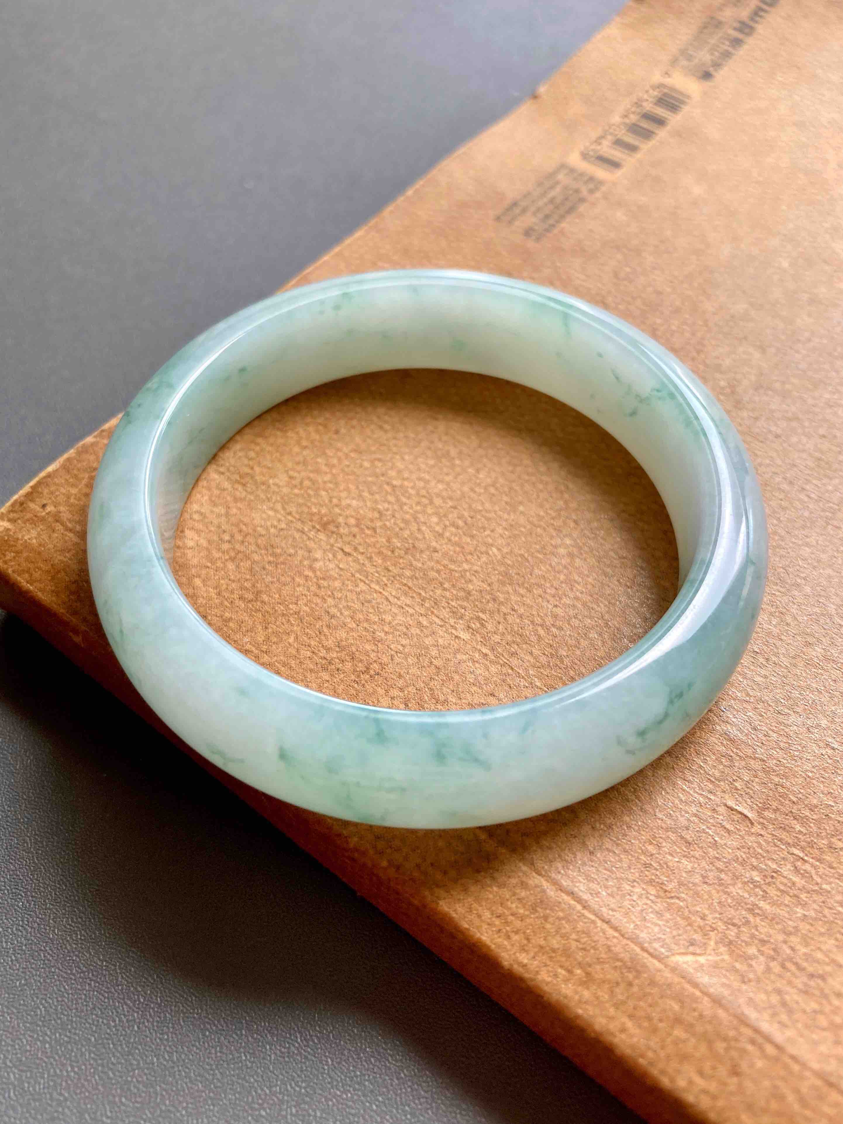 糯冰种飘花翡翠手镯56,牛奶一样细腻丝滑质感的手镯人人喜欢,再加一点果冻感是不是就更棒,推荐一个种水特别好的飘花手镯,晶莹剔透,细腻得几乎没有结构,飘小碎花,戴着显肤色,青春靓丽的那种,漂亮啊,内径56mm,宽13.3,厚8.3mm,手寸55到57都可以戴,是你吗
