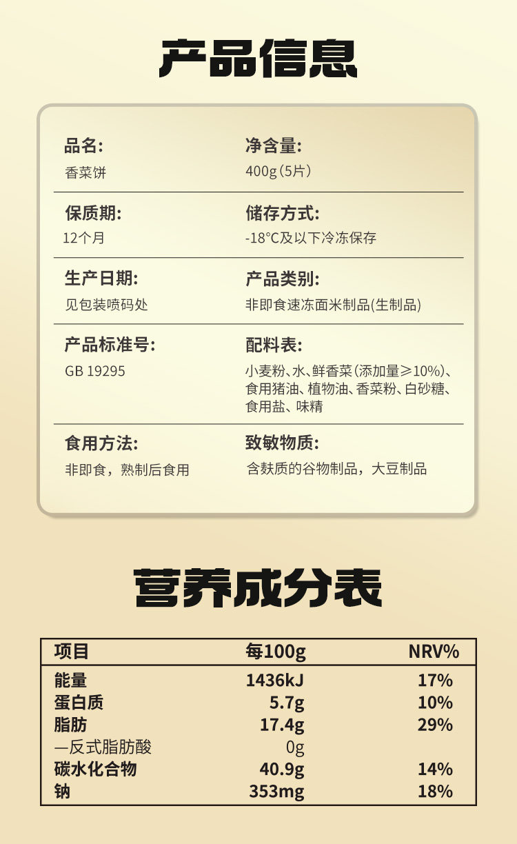 【注意事项】粮全其美香菜饼饼贮存条件为-18℃及以下冷冻保存,收到货后需及时放入冰箱冷冻。