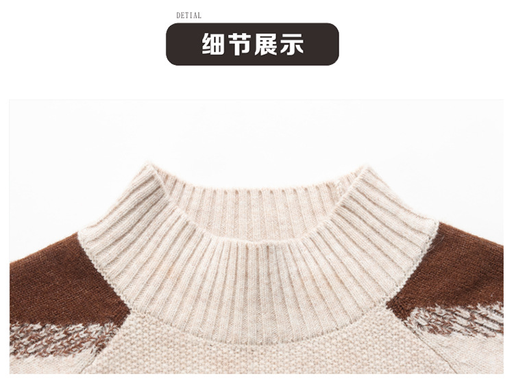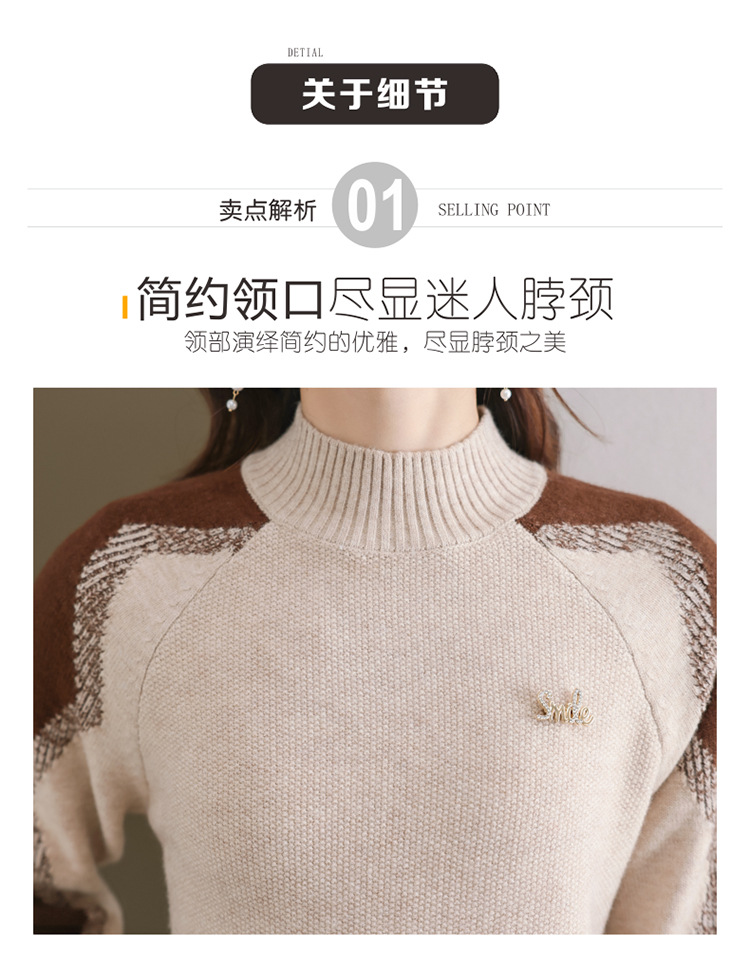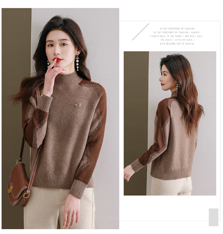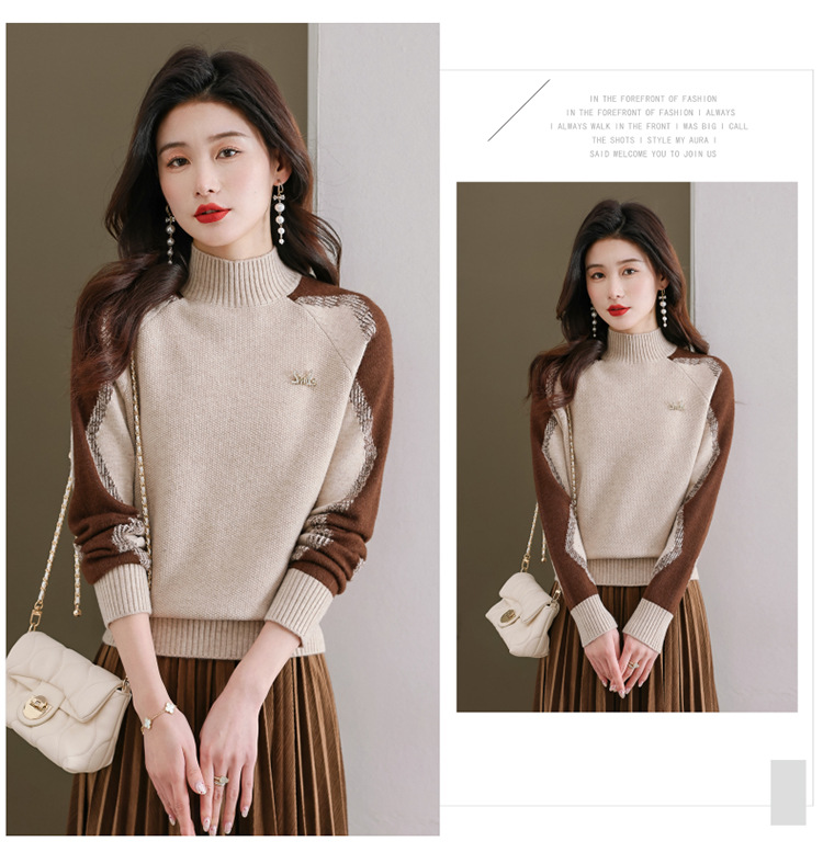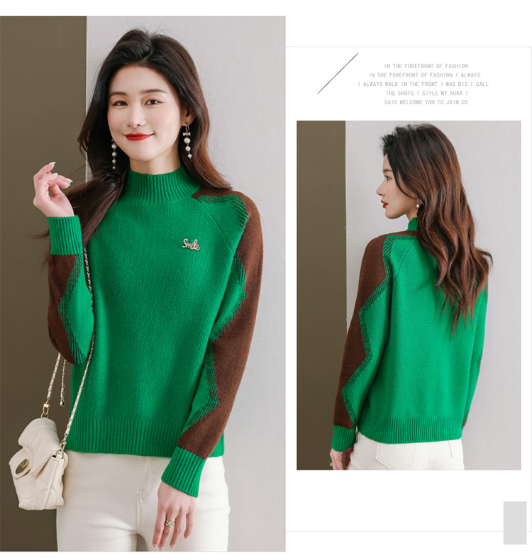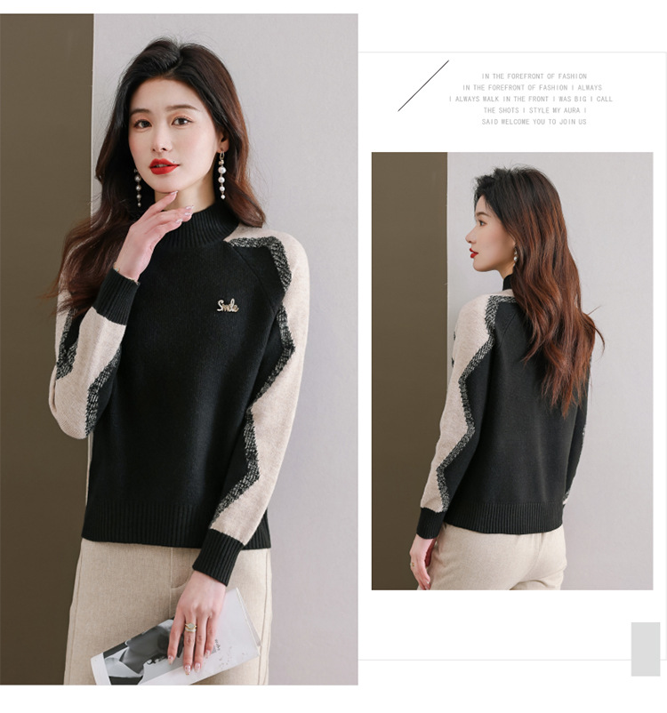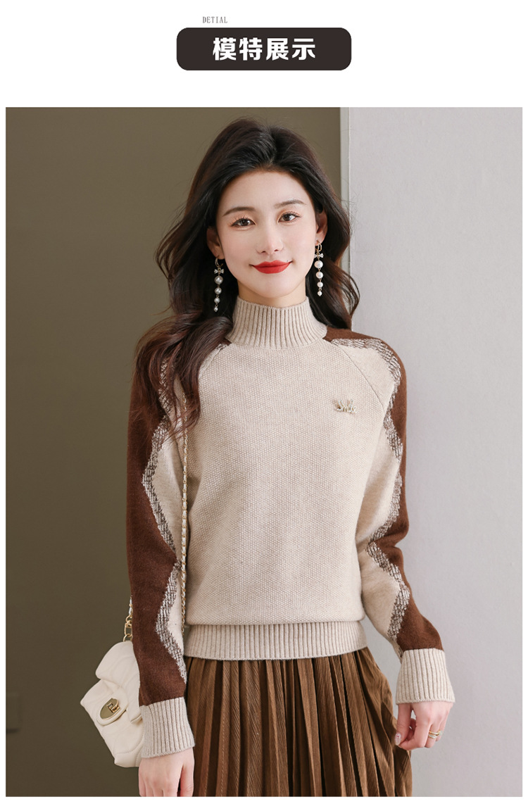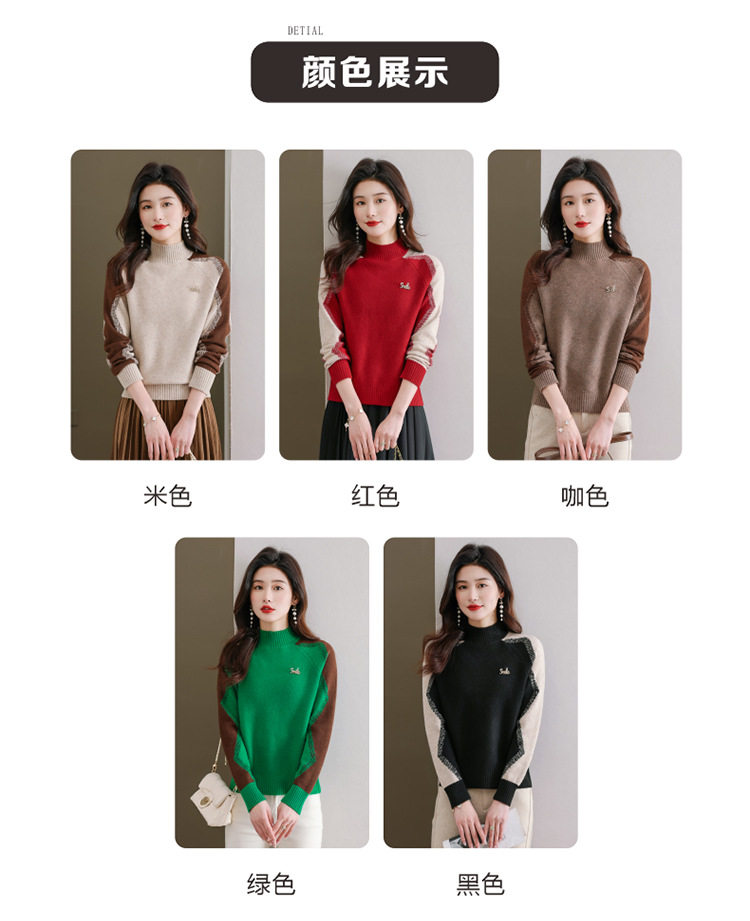 CC-101-90925半高领拼色羊毛毛衣女秋冬新款厚款慵懒风宽松时尚洋气针织上衣
