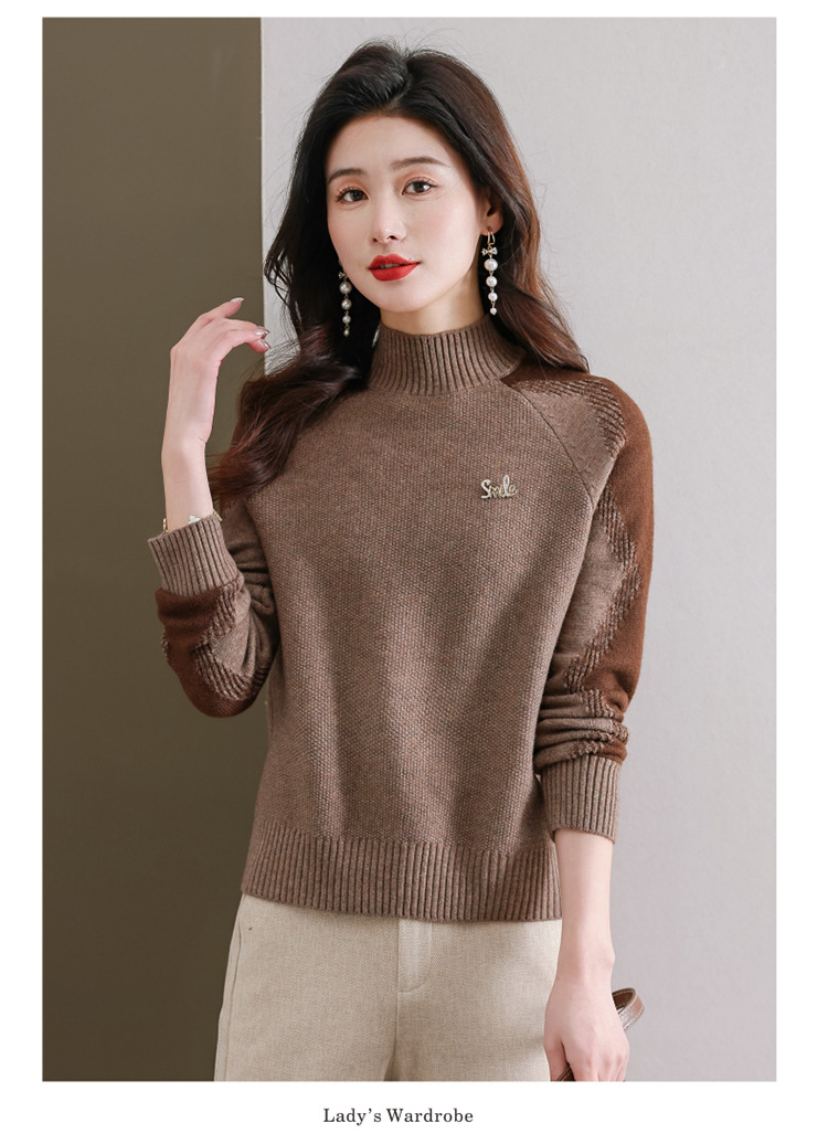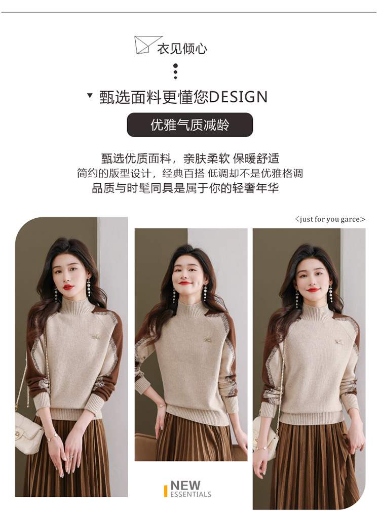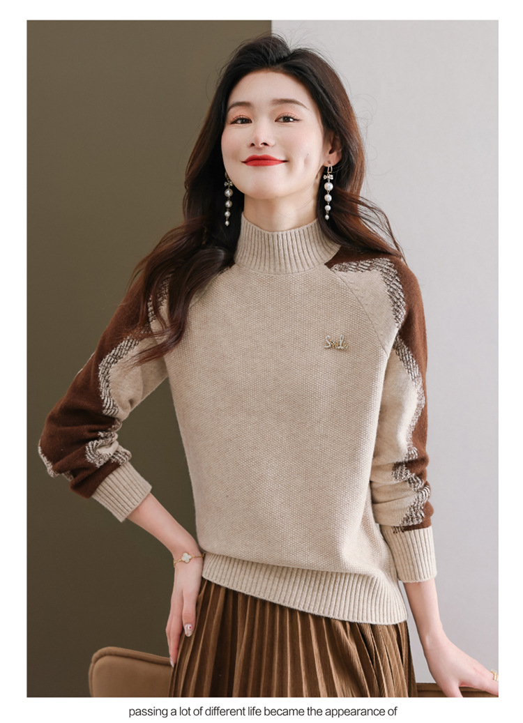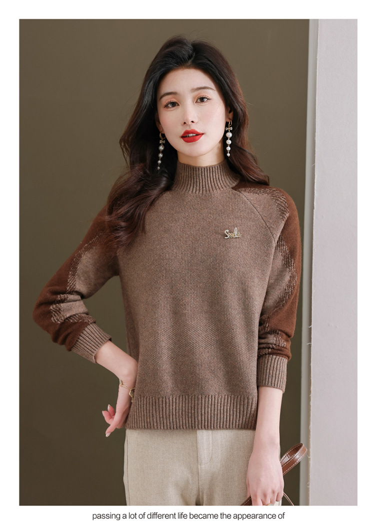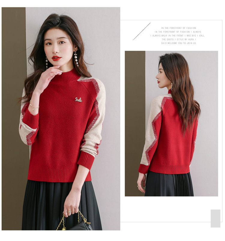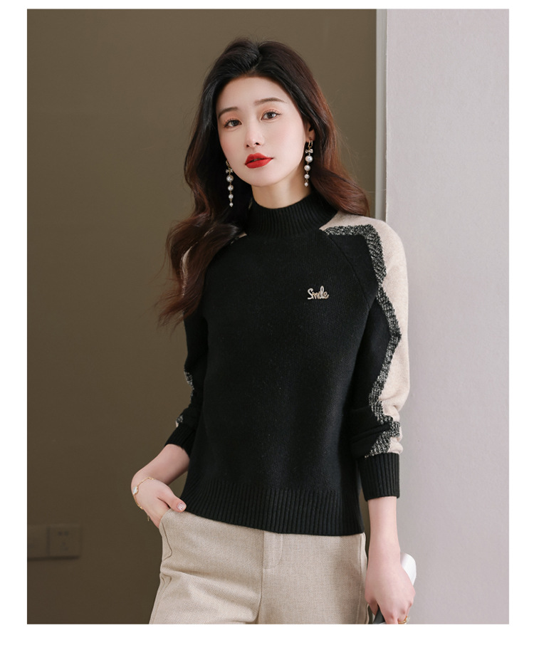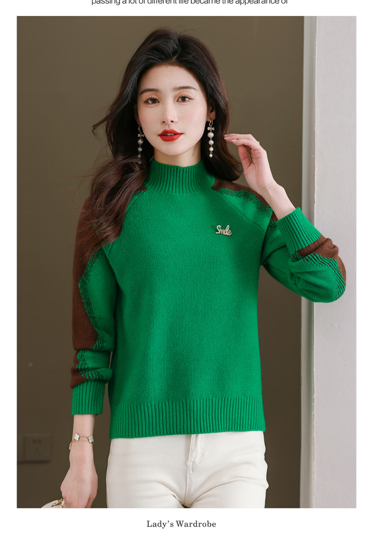 CC-101-90925半高领拼色羊毛毛衣女秋冬新款厚款慵懒风宽松时尚洋气针织上衣