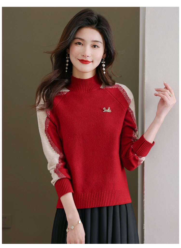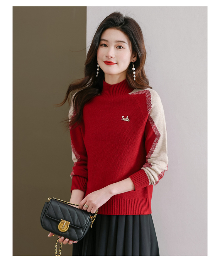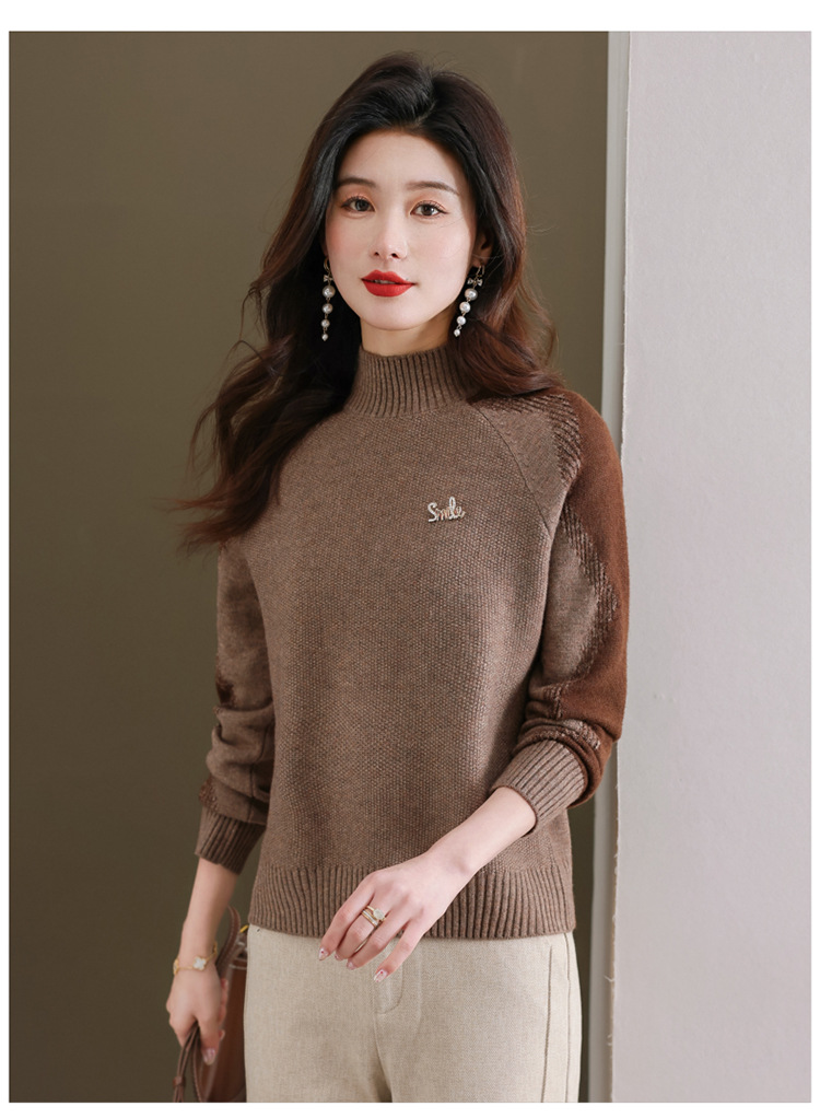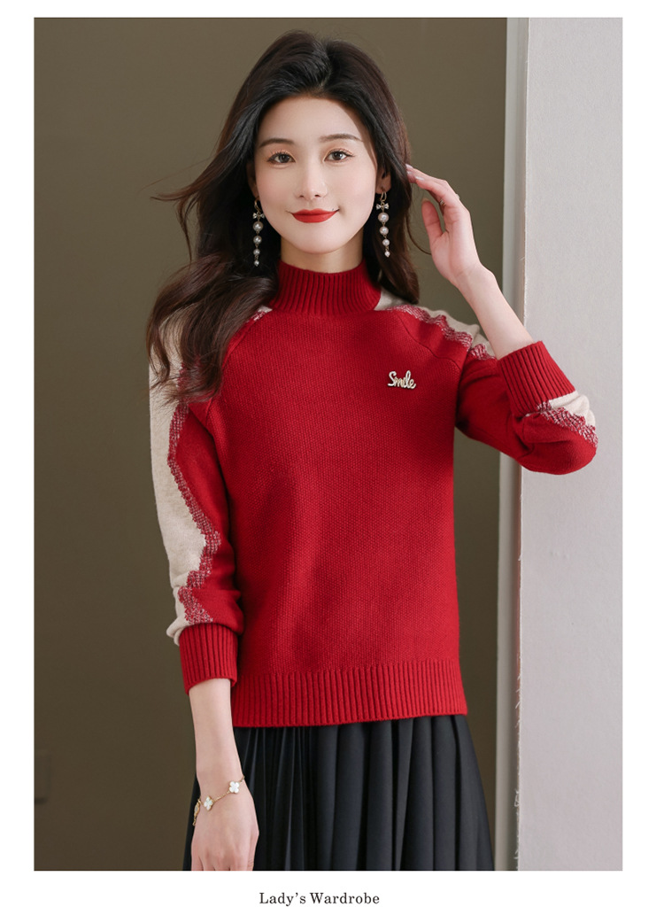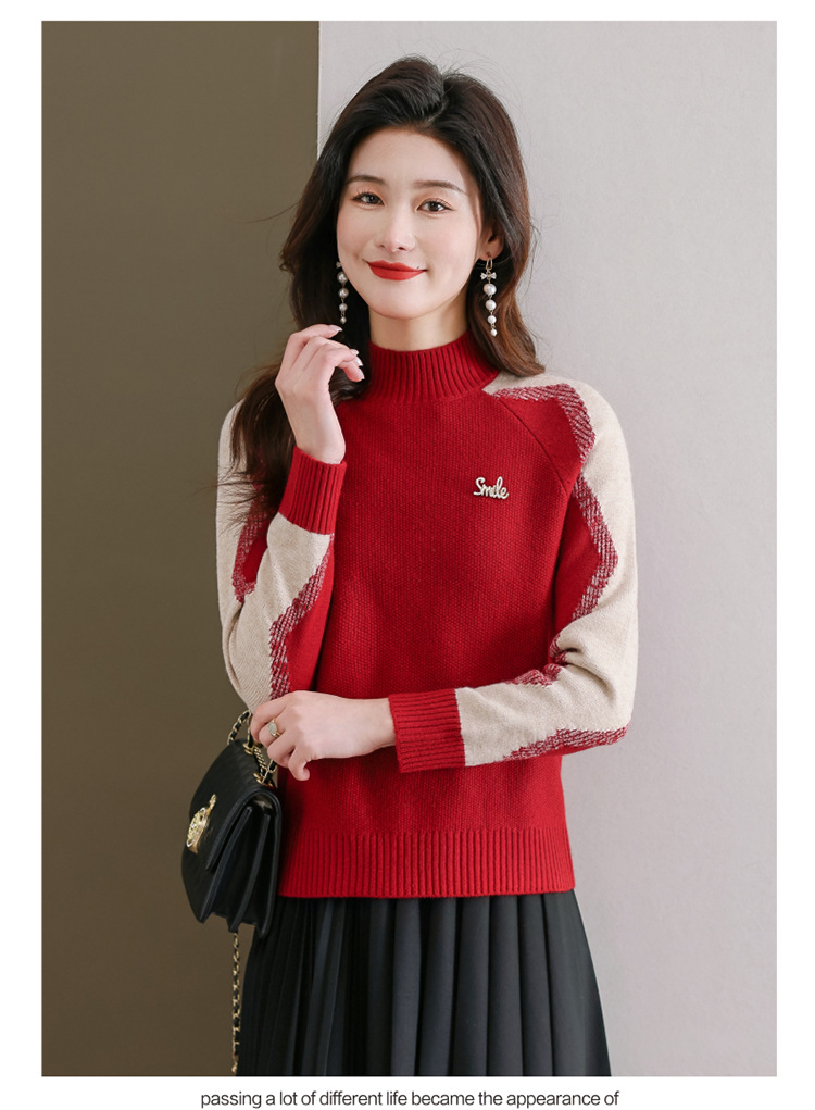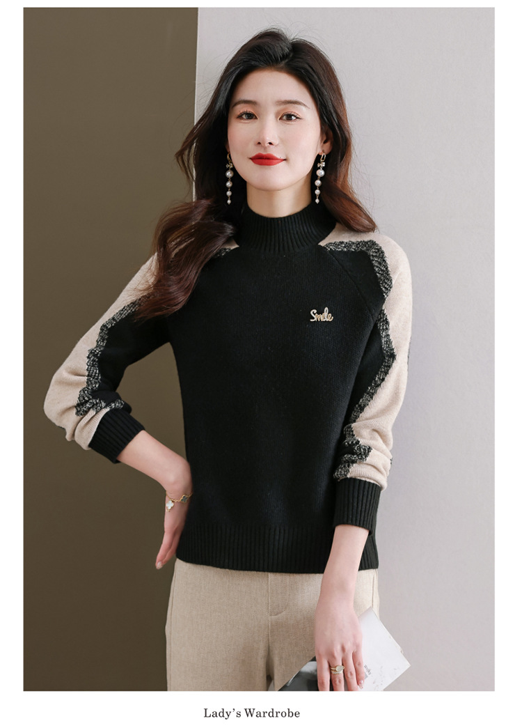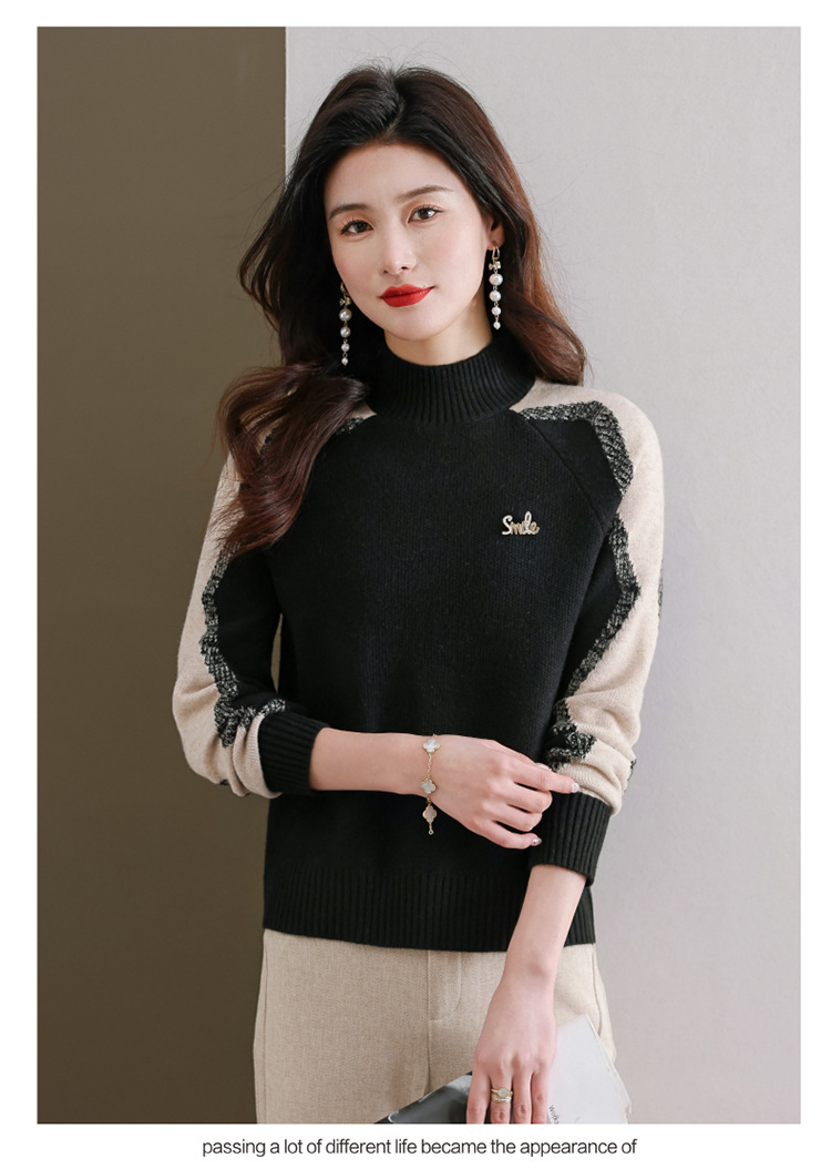 CC-101-90925半高领拼色羊毛毛衣女秋冬新款厚款慵懒风宽松时尚洋气针织上衣