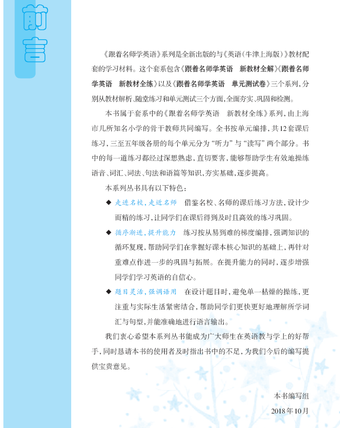 《跟着名师学英语》系列是全新出版的与《英语(牛津上海版)》教材配套的学习材料。这个套系包含《跟着名师学英语新教材全解》《跟着名师学英语新教材全练》以及《跟着名师学英语单元测试卷》三个系列,分别从教材解析、随堂练习和单元测试三个方面,全面夯实、巩固和检测。