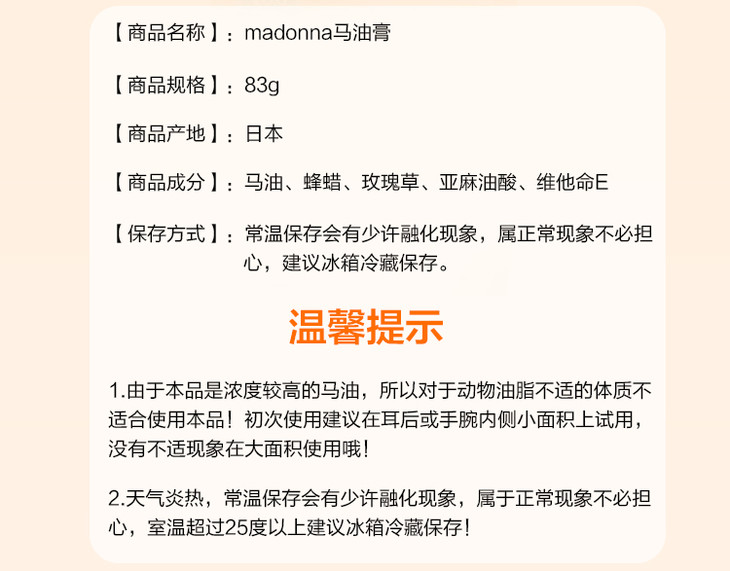 日本Madonna婴幼儿天然马油舒缓面霜宝宝护臀膏万用膏