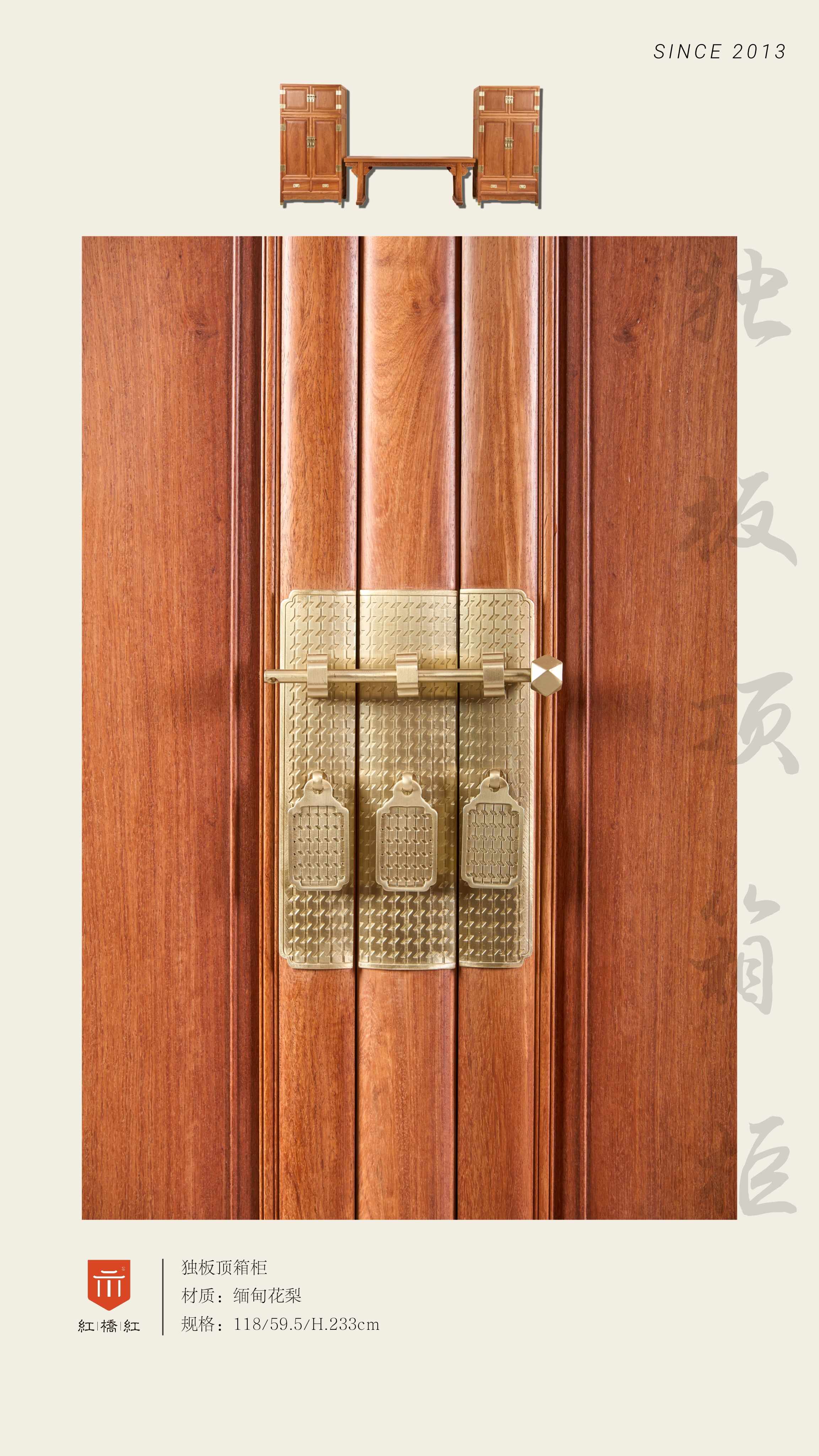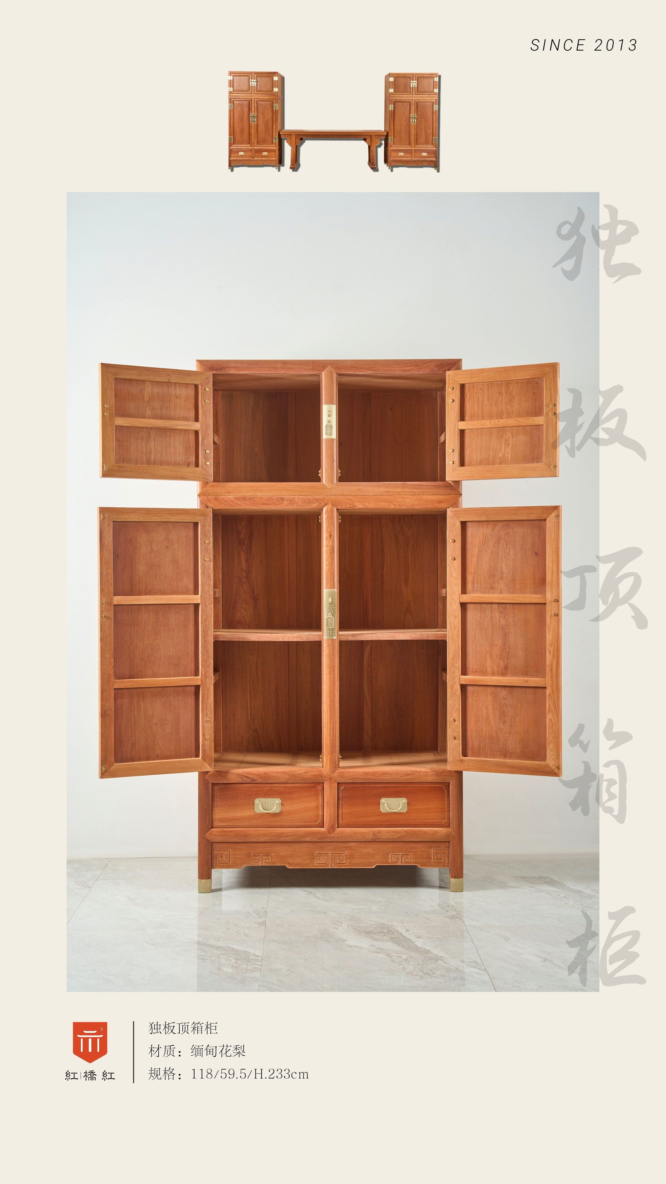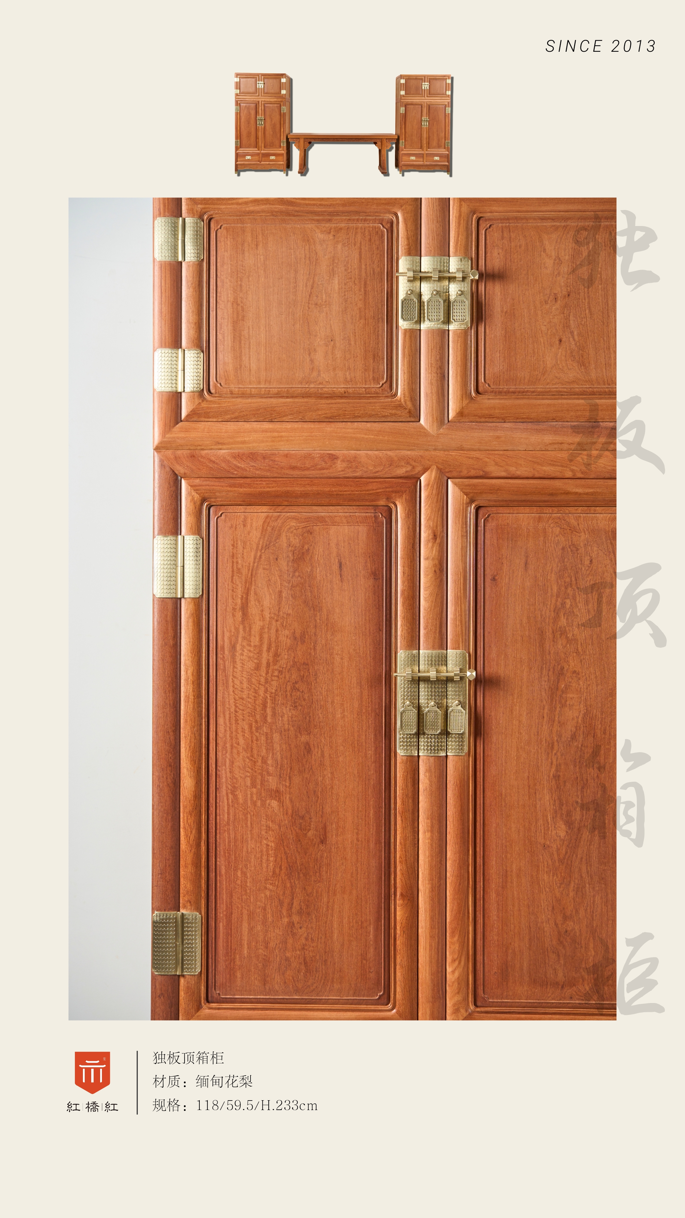 顶箱柜是大型的传统明式家具,是大器晚成的品类,明式大型四件柜造型基本趋同,粽角榫方式三碰肩结合,以方正平直为美,形体高大,通体光素无纹饰,通过取大材的天然优美纹理,结合铜件造型,令人赏心悦目。
