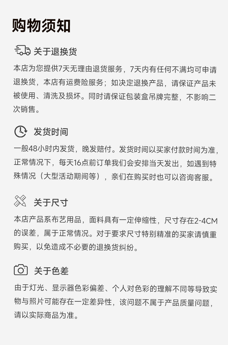 【售后标准】:支持七天无理由(无理由/拦截/拒收/改地址,同时顾客退回时满足包装完好,配件齐全,不影响二次销售,水洗过或其他影响二次销售行为,不予退换)