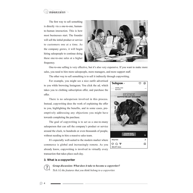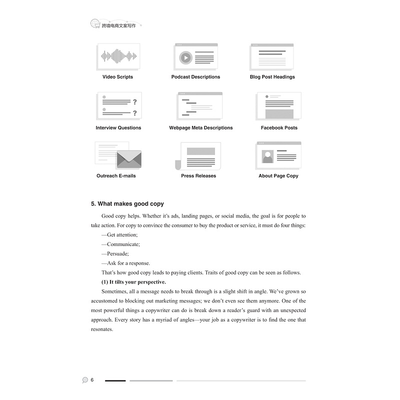 本教材面向高职跨境电商、国际商务、国际贸易及商务英语专业的二年级学生,针对跨境电商文案岗位的基本职责和要求,培养学生学习运用多种工具,针对跨境品牌文案、社交媒体文案、活动推广文案、SEO策略等要素来全方位学习文案策划与撰写的技巧,为跨境电商商务助理的文案策划能力奠定基础。本教材主要涵盖跨境领域包括网页文案、品牌文案、产品文案、营销文案等多项内容。主要特点有:案例丰富:案例来源为电商企业一手案例或国际经典文案;融合语言文化:文案撰写需要较强的语言能力和跨文化意识,本书针对高职学生的需求,突出语言能力和跨文化意识。