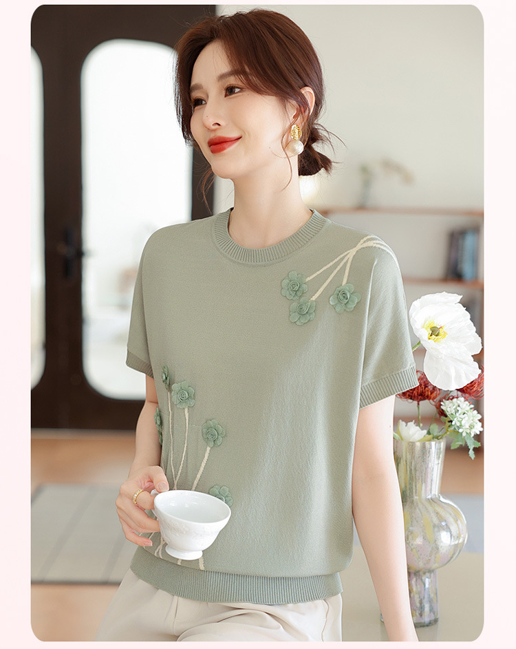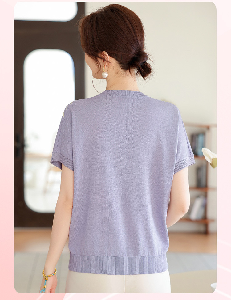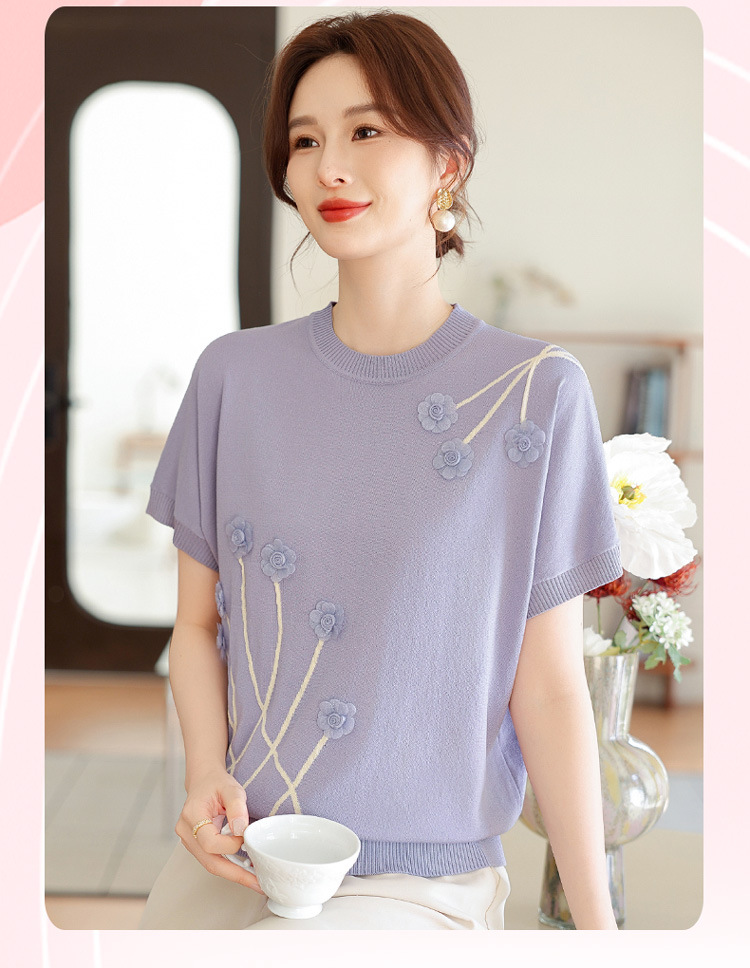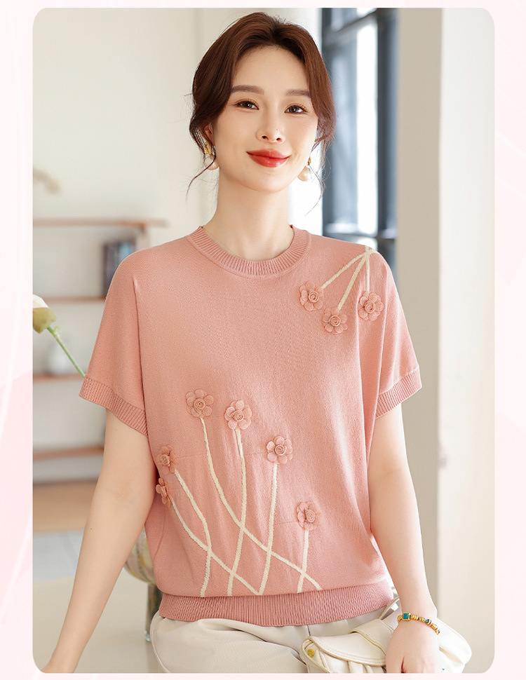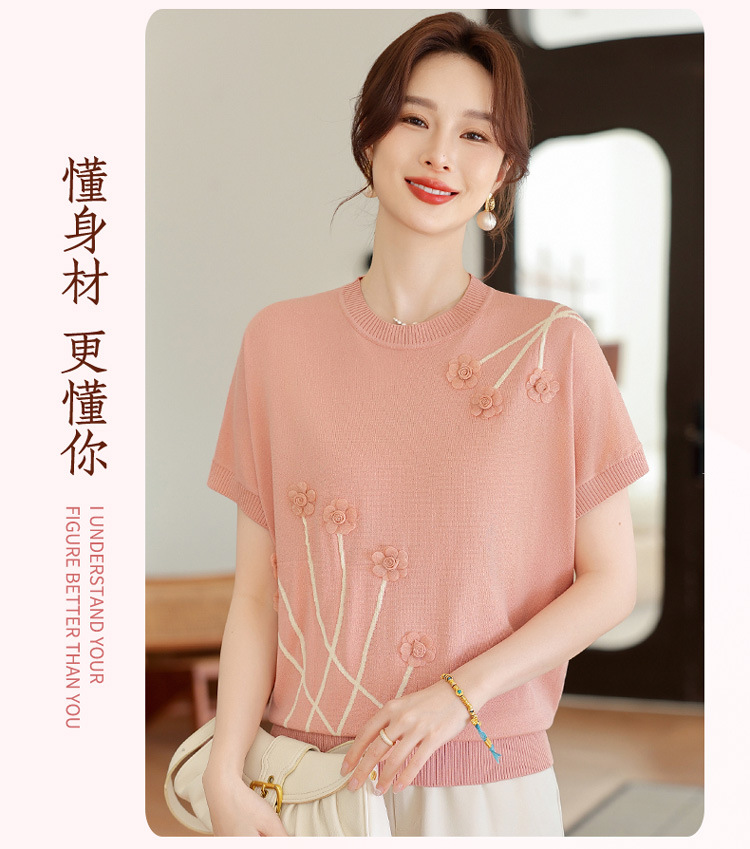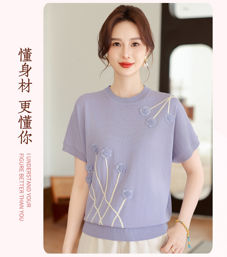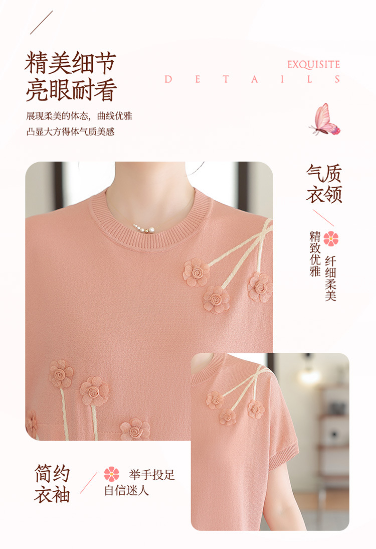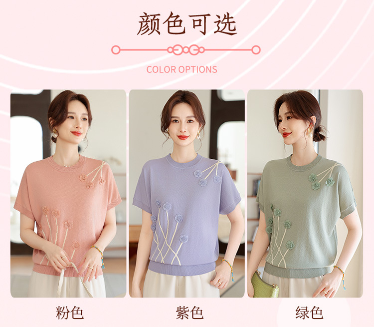 W052-2516-75-138妈妈夏装短袖绣花T恤2025新款洋气中老年女高档冰丝小衫薄款上衣