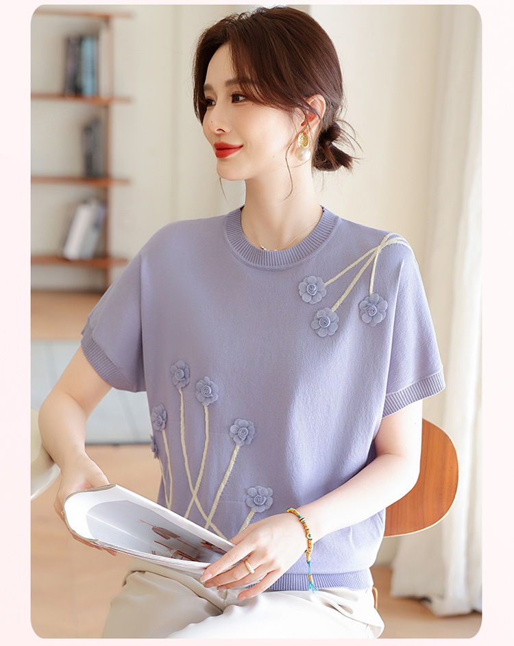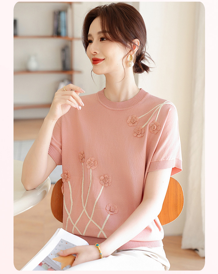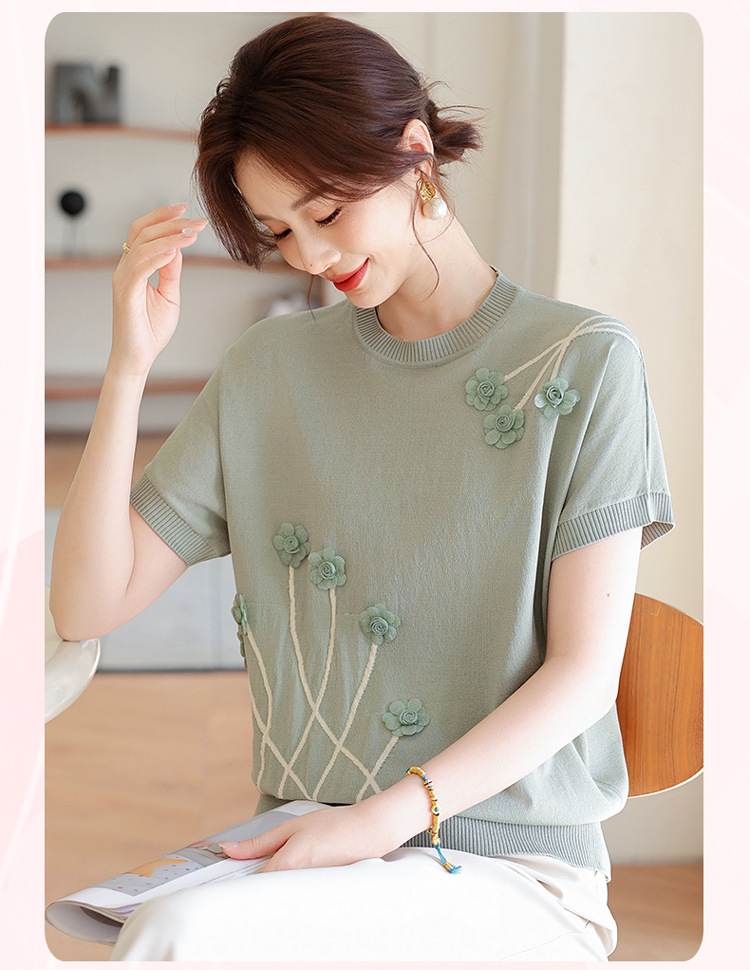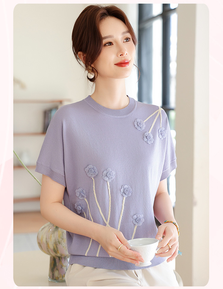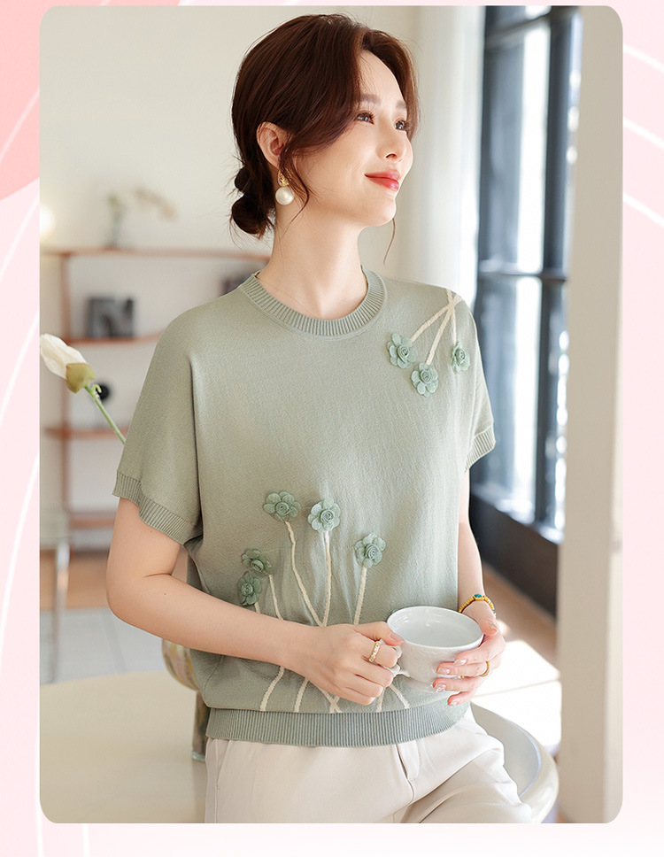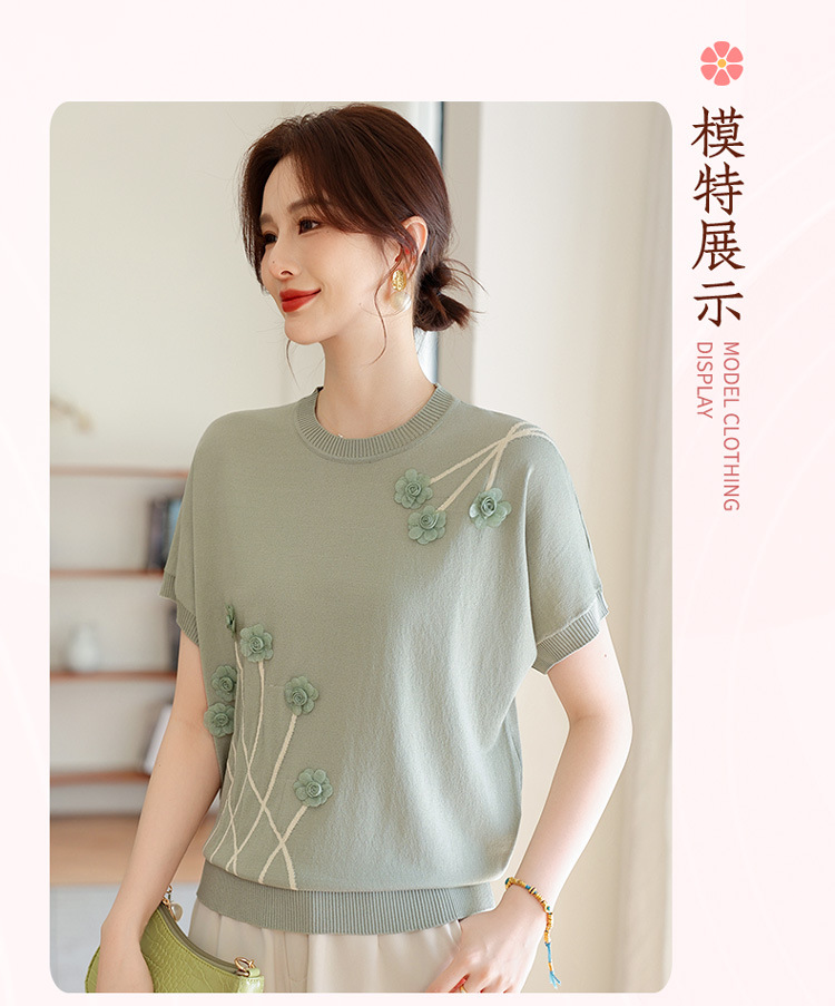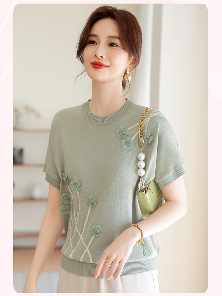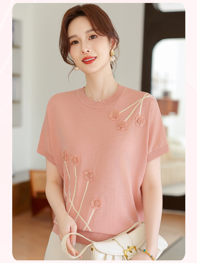 W052-2516-75-138妈妈夏装短袖绣花T恤2025新款洋气中老年女高档冰丝小衫薄款上衣