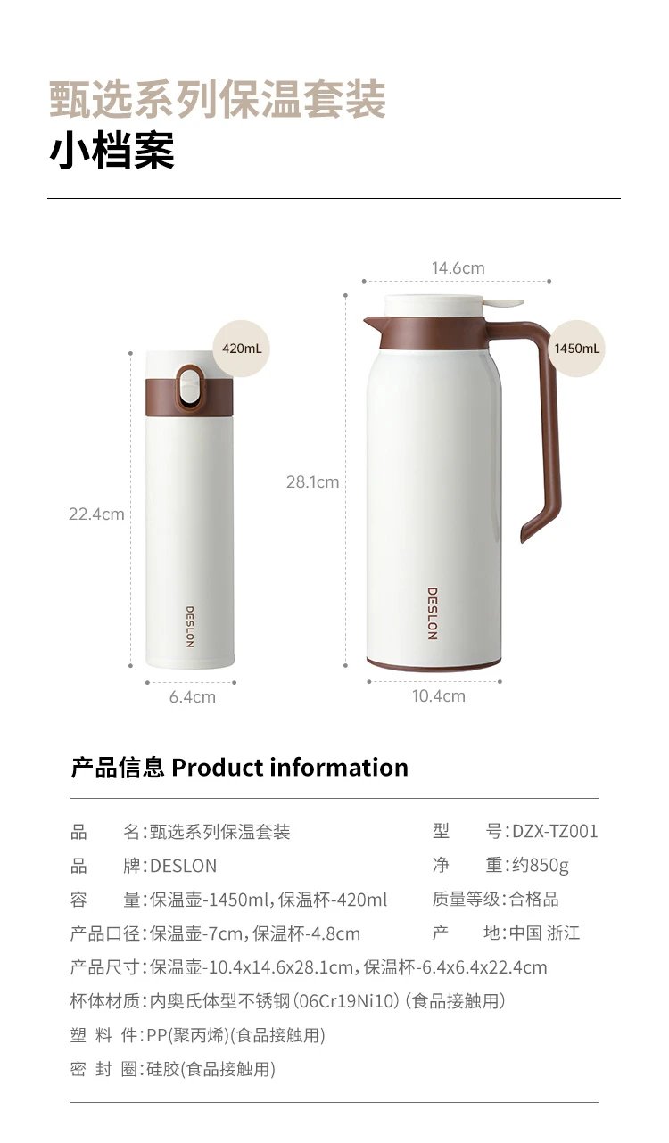 德世朗DESLON保温壶+保温杯 内壁304不锈钢 壶盖密封性很好 保温又保冷 送礼自留皆宜基地直邮